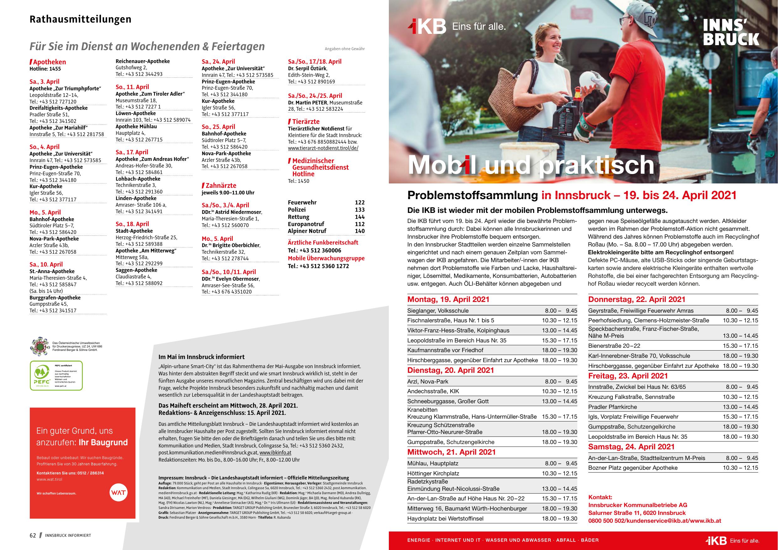 Auflage: 79.000 Stück; geht per Post an alle Haushalte in Innsbruck · Eigentümer, Herausgeber, Verleger: Stadtgemeinde Innsbruck