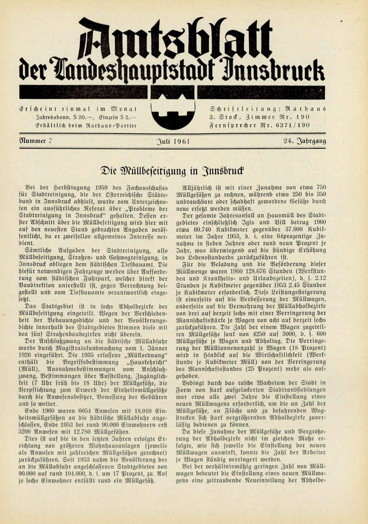 Stadtreinigung in Innsbruck" gehalten. Dessen erster Abschnitt über die Müllbeseitigung wird hier mit