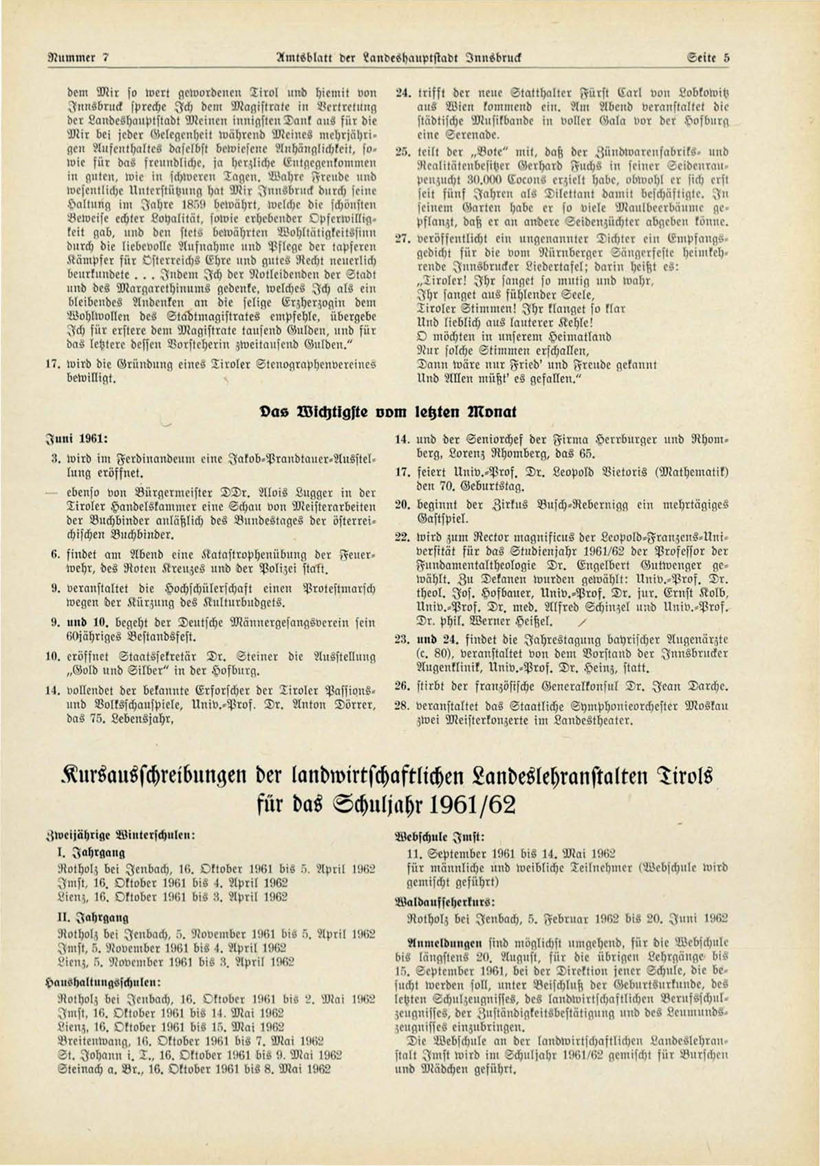 22. wird zum Rector maguificus der Leovold-Franzcns-Uuivcrsität für das Studienjahr 1961/62 der Professor der