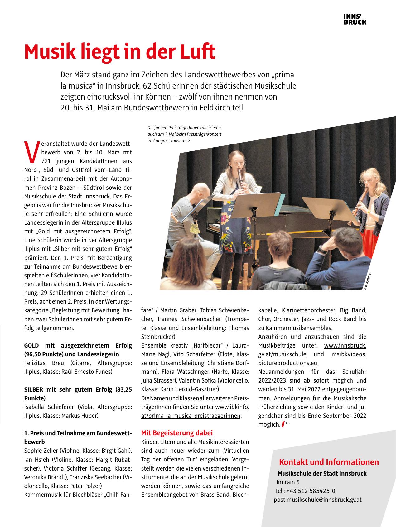 Musikschule der Stadt Innsbruck. Das Ergebnis war für die Innsbrucker Musikschule sehr erfreulich: Eine Schülerin wurde
