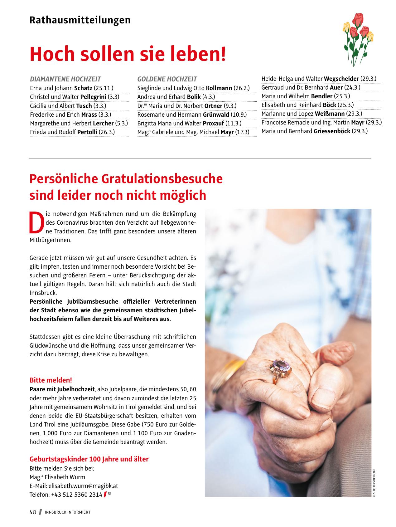 Land Tirol eine Jubiläumsgabe. Diese Gabe (750 Euro zur Goldenen, 1.000 Euro zur Diamantenen und 1.100 Euro zur Gnadenhochzeit) muss über die Gemeinde beantragt werden.