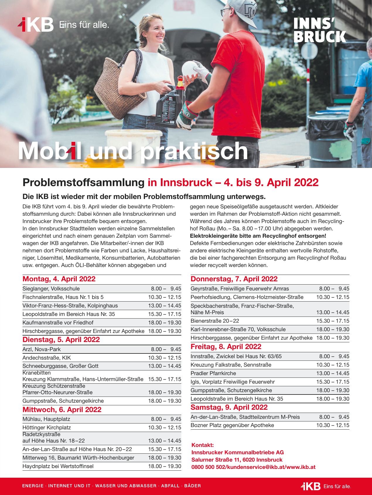 Die IKB führt vom 4. bis 9. April wieder die bewährte Problemstoffsammlung durch: Dabei können alle Innsbruckerinnen und
