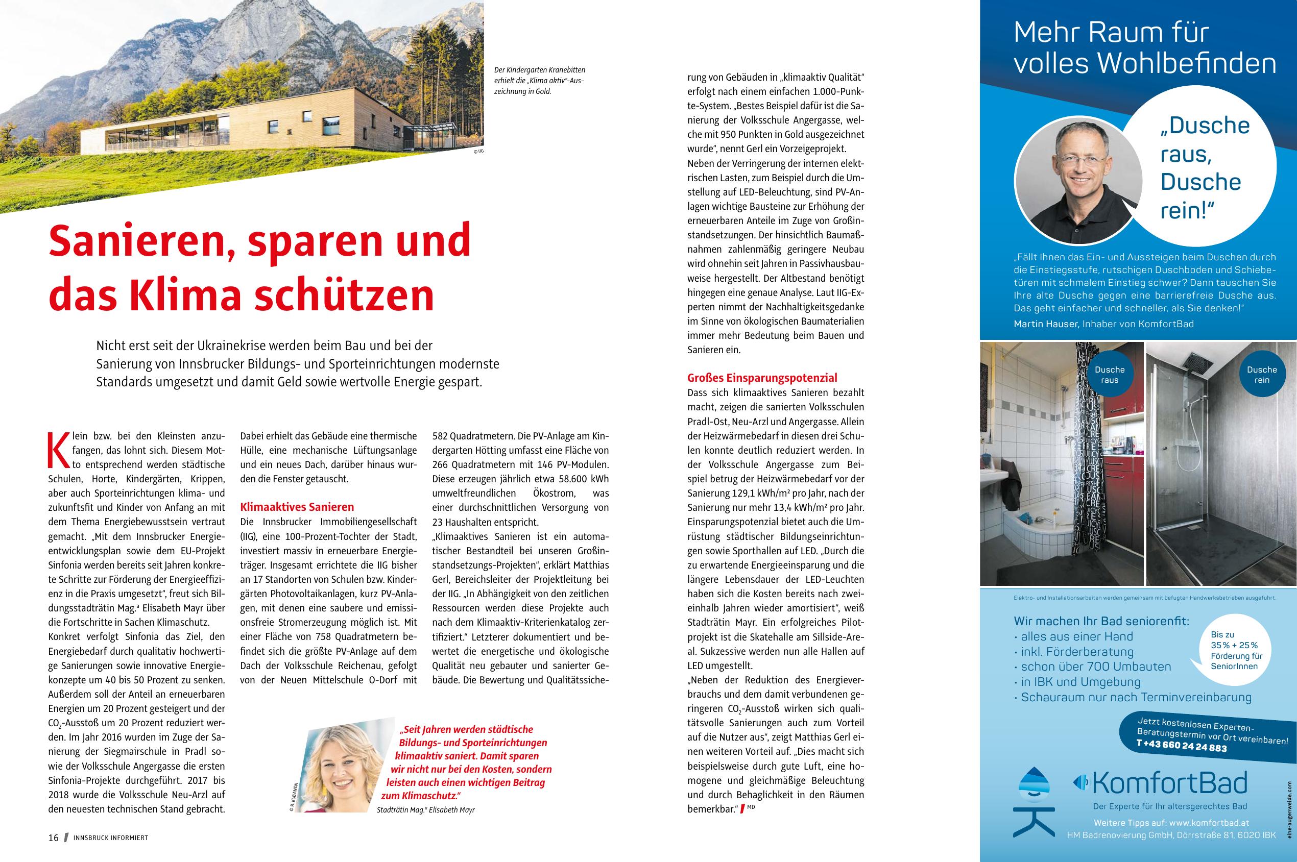 CO2-Ausstoß um 20 Prozent reduziert werden. Im Jahr 2016 wurden im Zuge der Sanierung der Siegmairschule in Pradl sowie der Volksschule Angergasse die ersten