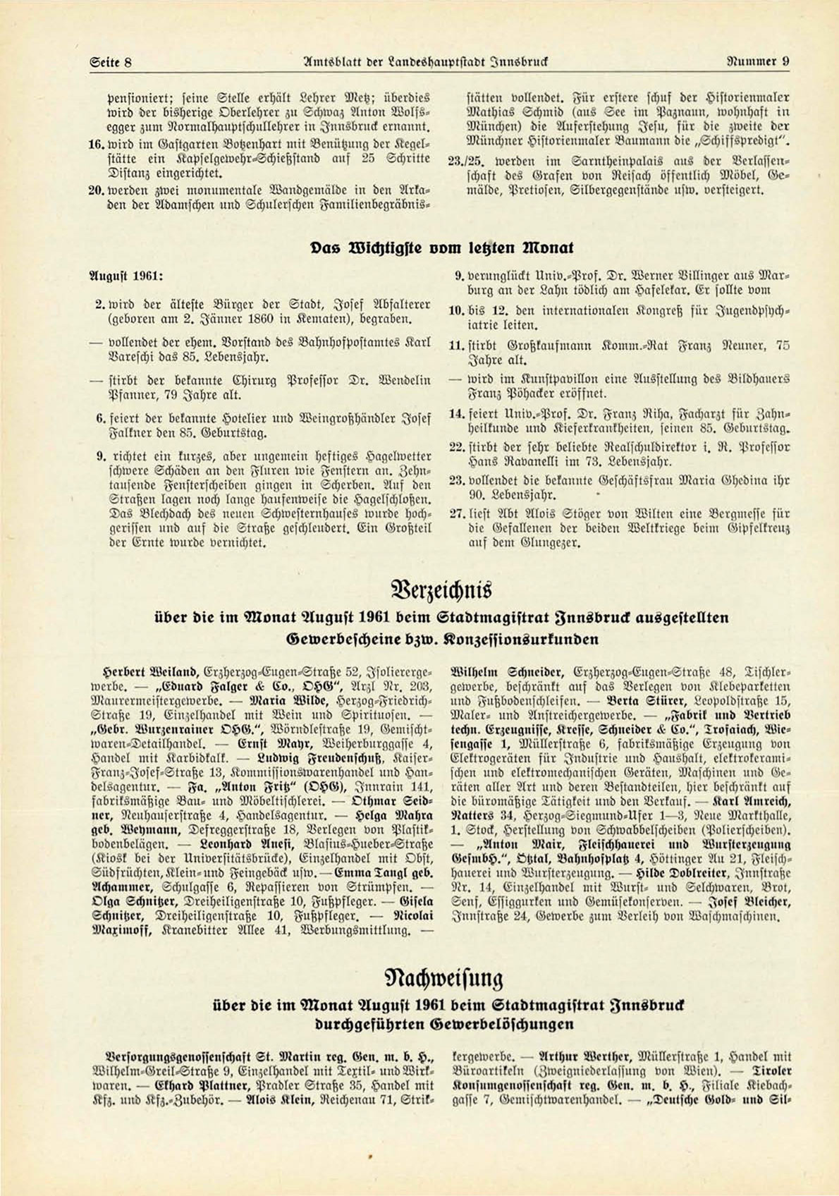 über die im Monat August 1961 beim Stadtmagistrat Innsbruck