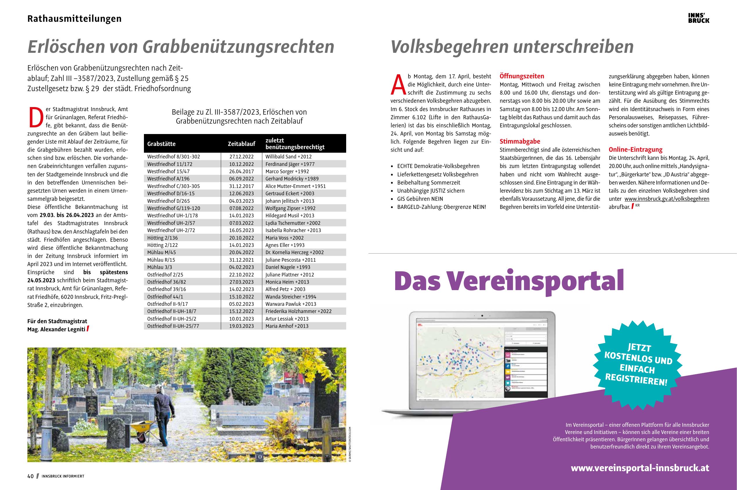 24.05.2023 schriftlich beim Stadtmagistrat Innsbruck, Amt für Grünanlagen, Referat Friedhöfe, 6020 Innsbruck, Fritz-PreglStraße 2, einzubringen.