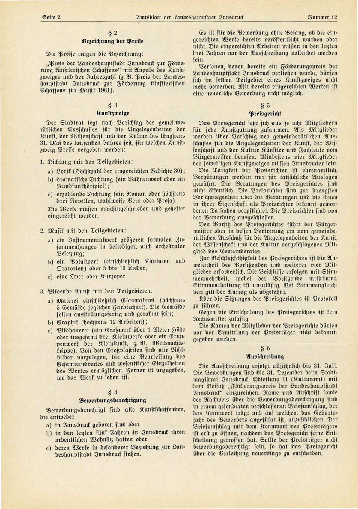 „Preis der Landeshauptstadt Innsbruck zur Förderung künstlerischen Schaffens" mit Angabe des Kunstzweiges und der Jahreszahl (z.V. Preis der Landeshauptstadt Innsbruck zur Förderung künstlerischen