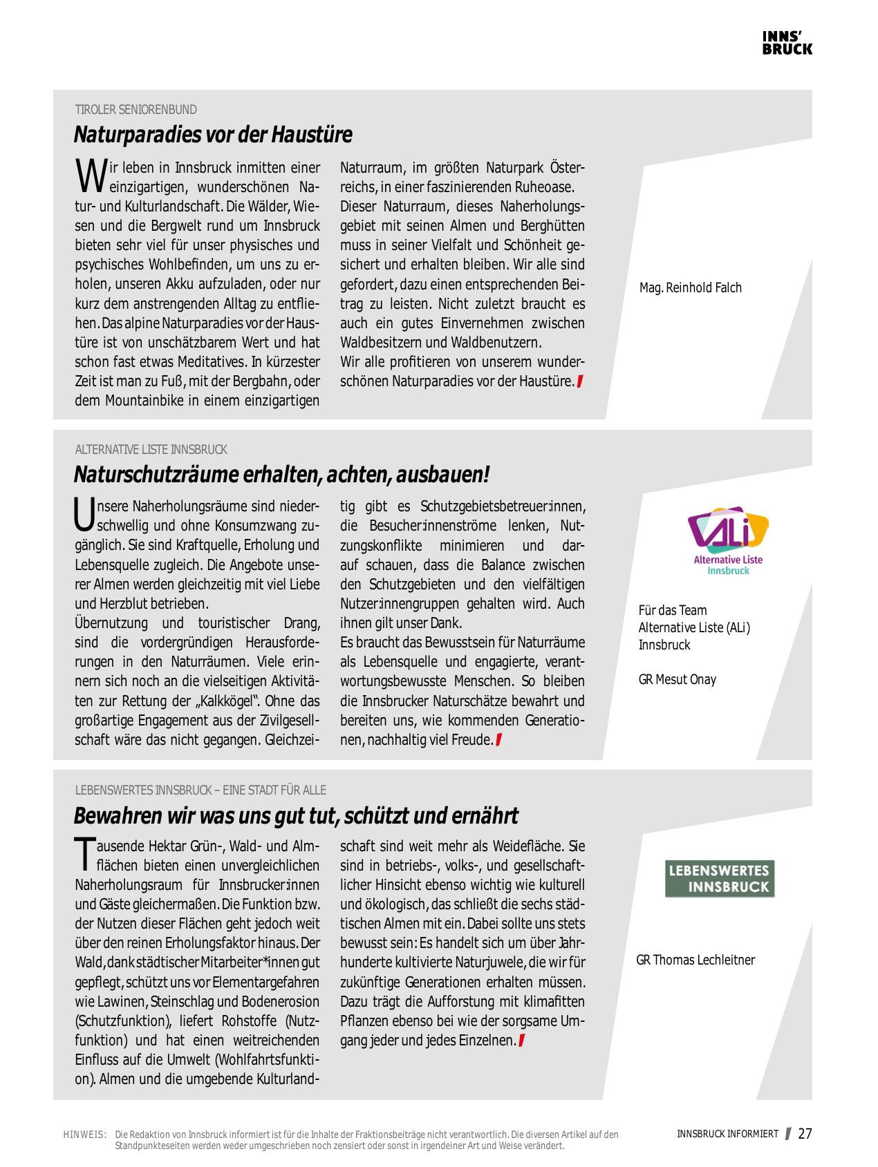 H I N W EI S : Die Redaktion von Innsbruck informiert ist für die Inhalte der Fraktionsbeiträge nicht verantwortlich. Die diversen Artikel auf den