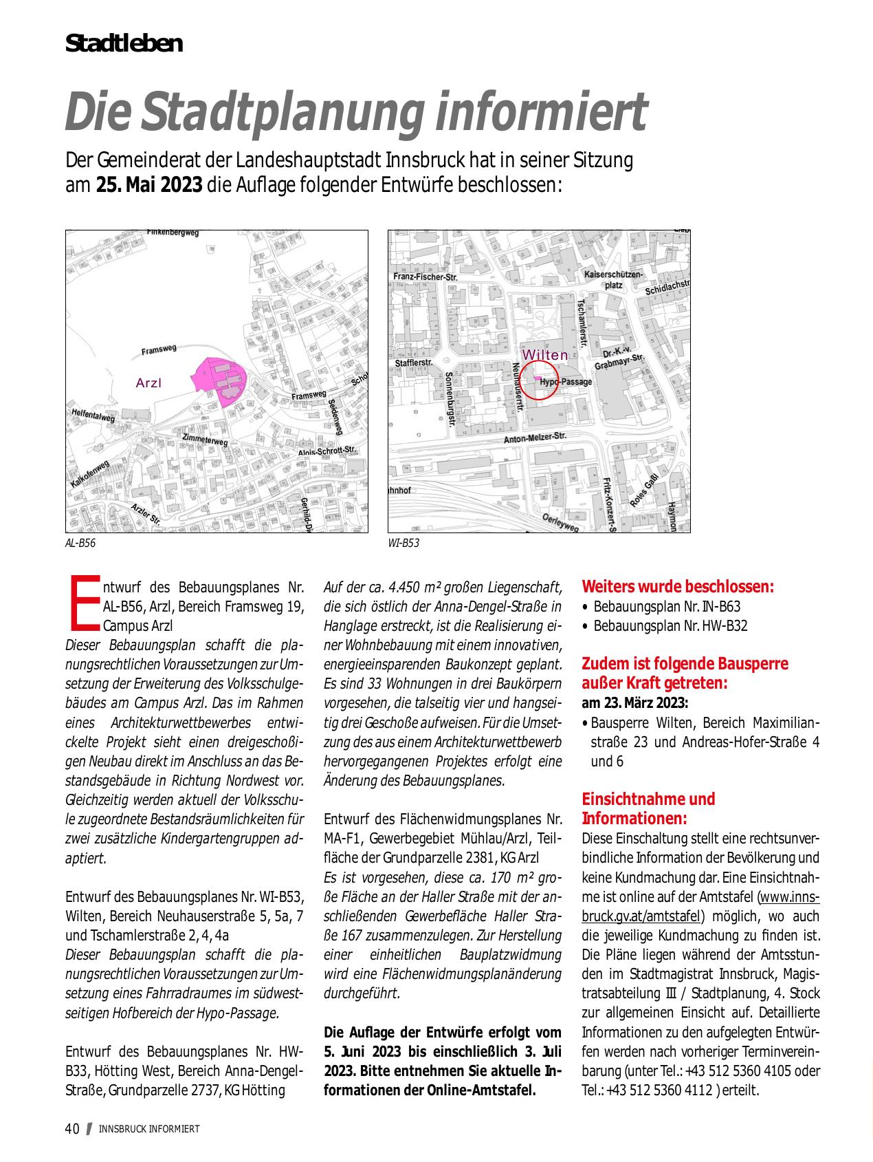 Die Auflage der Entwürfe erfolgt vom Informationen zu den aufgelegten Entwür5. Juni 2023 bis einschließlich 3. Juli fen werden nach vorheriger Terminverein2023. Bitte entnehmen Sie aktuelle In- barung (unter Tel.: +43 512 5360 4105 oder