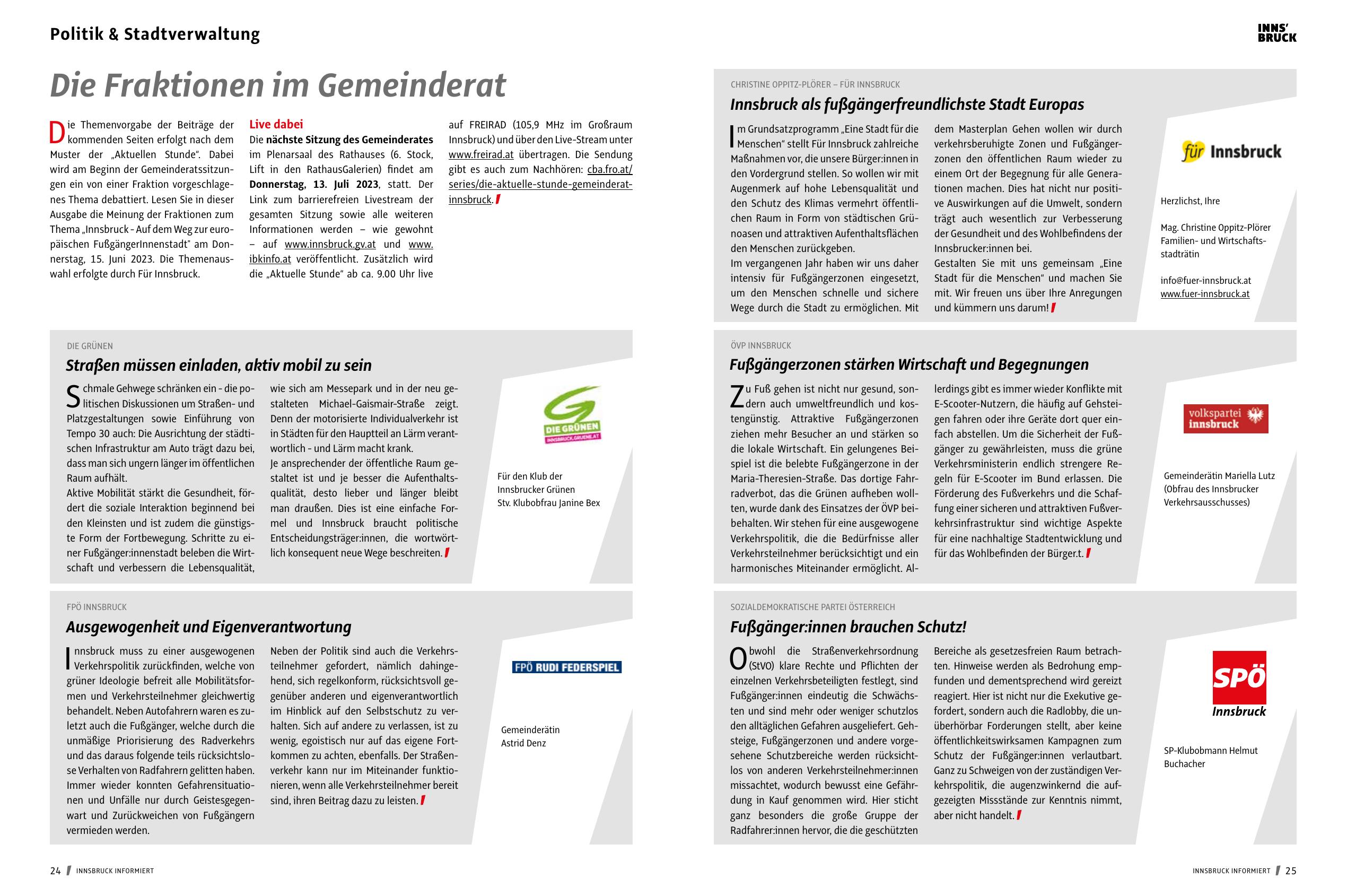 Thema „Innsbruck - Auf dem Weg zur europäischen FußgängerInnenstadt" am Donnerstag, 15. Juni 2023. Die Themenauswahl erfolgte durch Für Innsbruck.