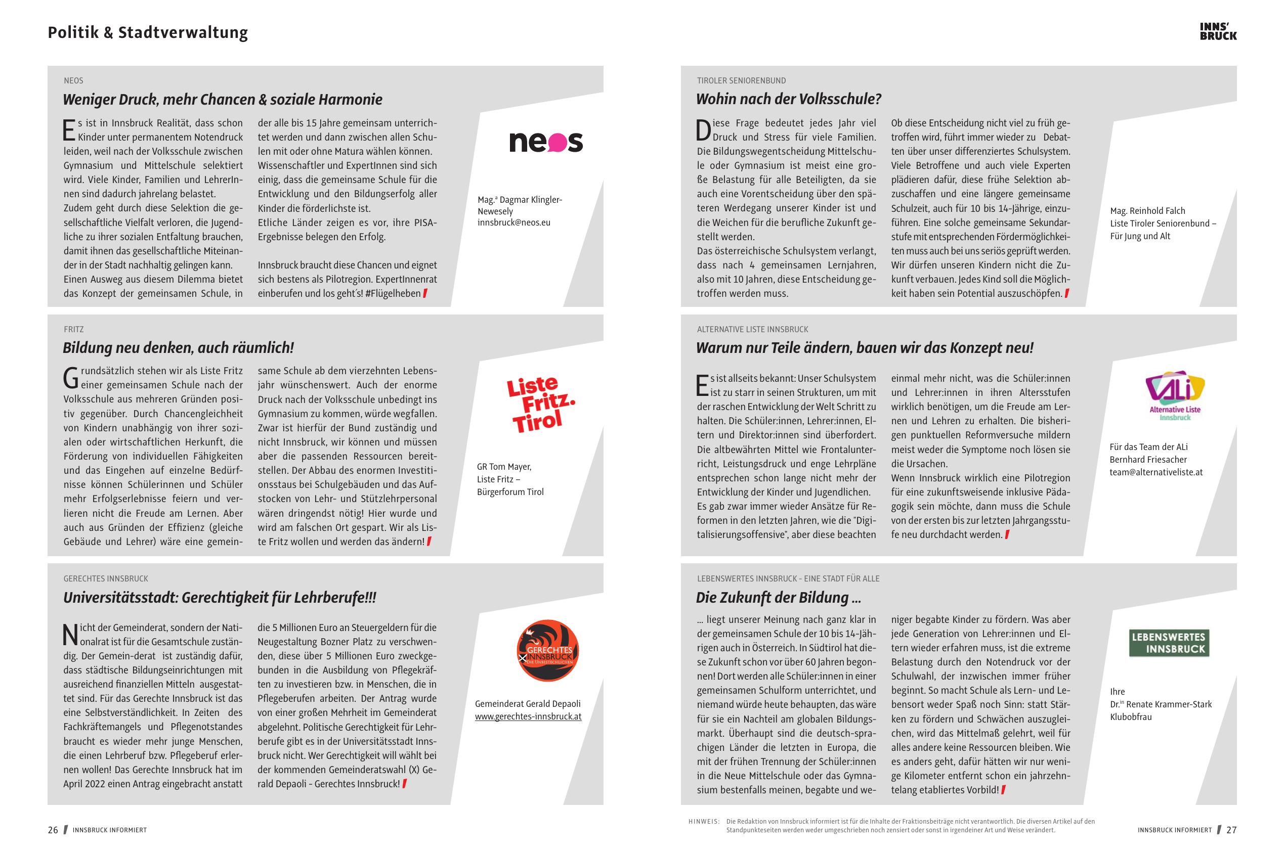 H I N W EI S : Die Redaktion von Innsbruck informiert ist für die Inhalte der Fraktionsbeiträge nicht verantwortlich. Die diversen Artikel auf den