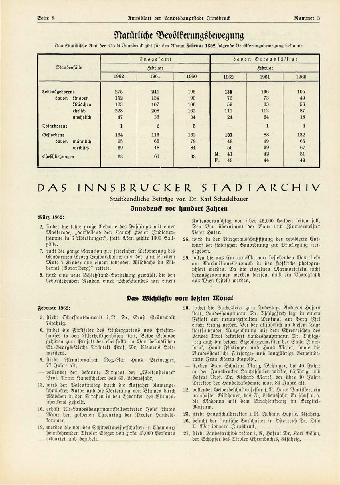 Statistische Amt der Staöt Innsbruck ^ibt für den Monat Februar 19^2 folacn^c vcl"ölkcrunaobcrocauna bekannt: