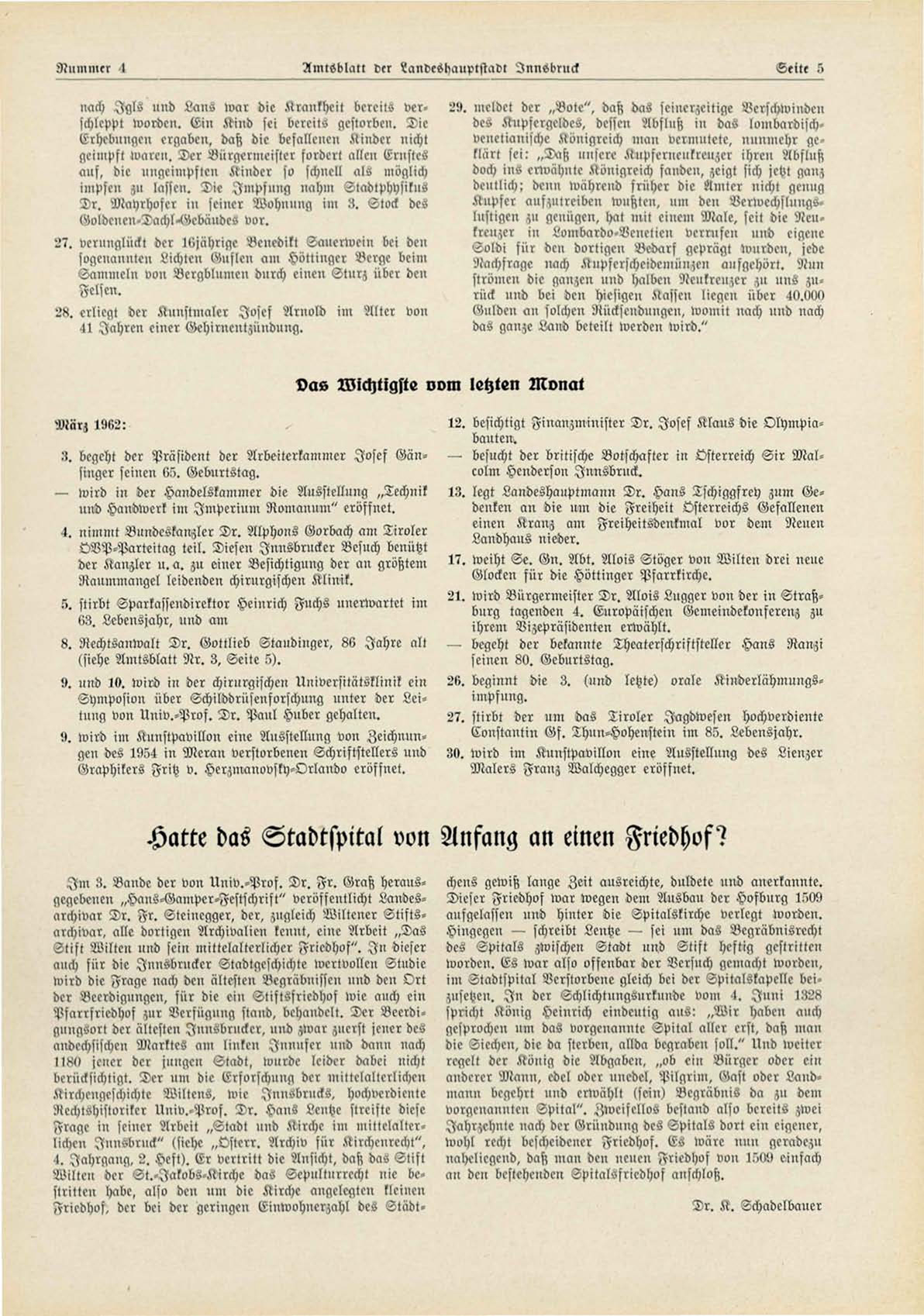 I m 3. Bande der von Univ.-Prof. D r . F r . Graß herausgegebenen „Hans-Gamper-Fcstschrift" veröffentlicht Landesarchivar D r . F r . Steincgger, der, zugleich Wiltener S t i f t s archivar, alle dortigen Archivalien kennt, eine Arbeit „Das