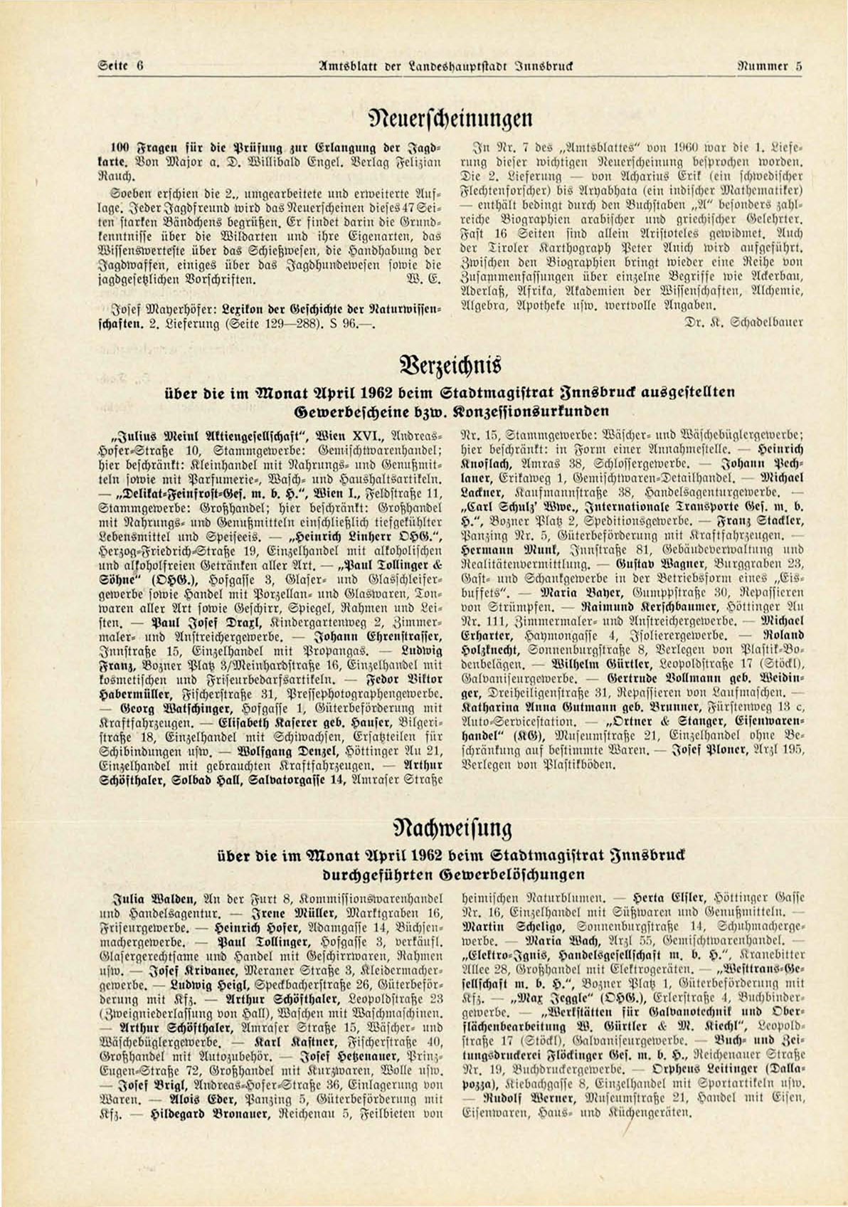 über die im Monat A p r i l 1962 beim Stadtmagistrat Innsbruck ausgestellten