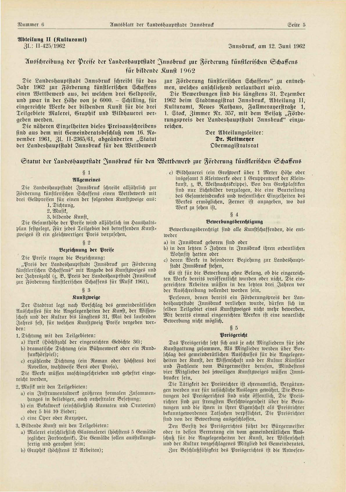 Statut der ^alldesbauptstadt Innsbruck für den Wettbewerb zur Förderung künstlerischen Schaffens
