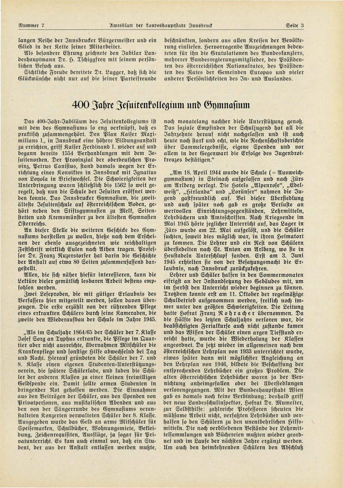 Unterbringung waren schließlich bis 1."ilì2 so weit geregelt, daß nun die Schule der Jesuiten eröffnet werden konnte. Das Innsbrucker Gymnasium, die zweitälteste Iesuitenschule auf österreichischem Voden, gehört neben den Stiftsgymnnsien zu Melk, Seitenstetten nnd Kremsmünster zu den ältesten Gymnasien