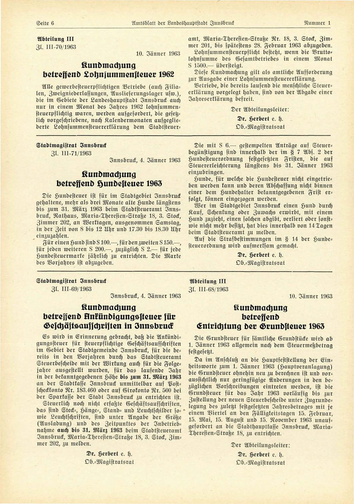 15. Mai, 15. August und 15" November 1963 unaufgefordert an die Sladthanpttasse Innsbruck. MariaTheresien-Straße 18. zu entrichten.