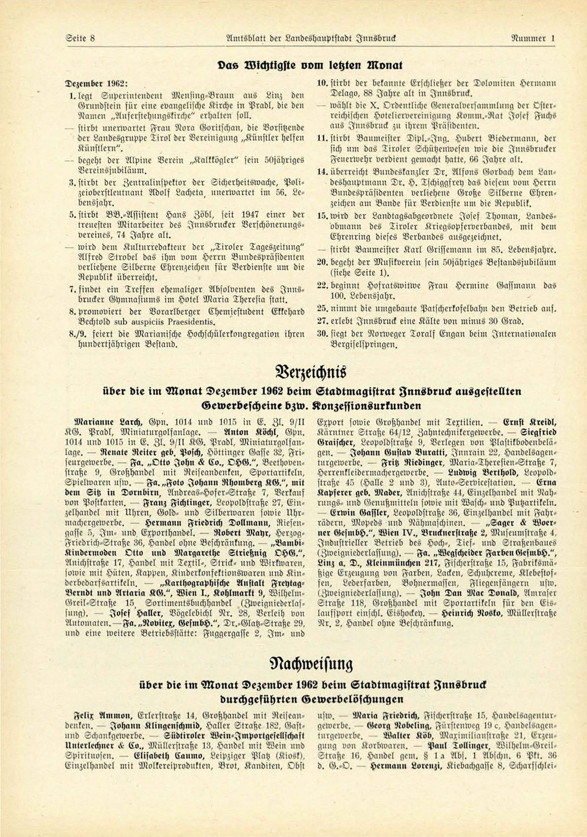 über die im Monat Dezember 1962 beim Stadtmagistrat Innsbruck ausgestellten