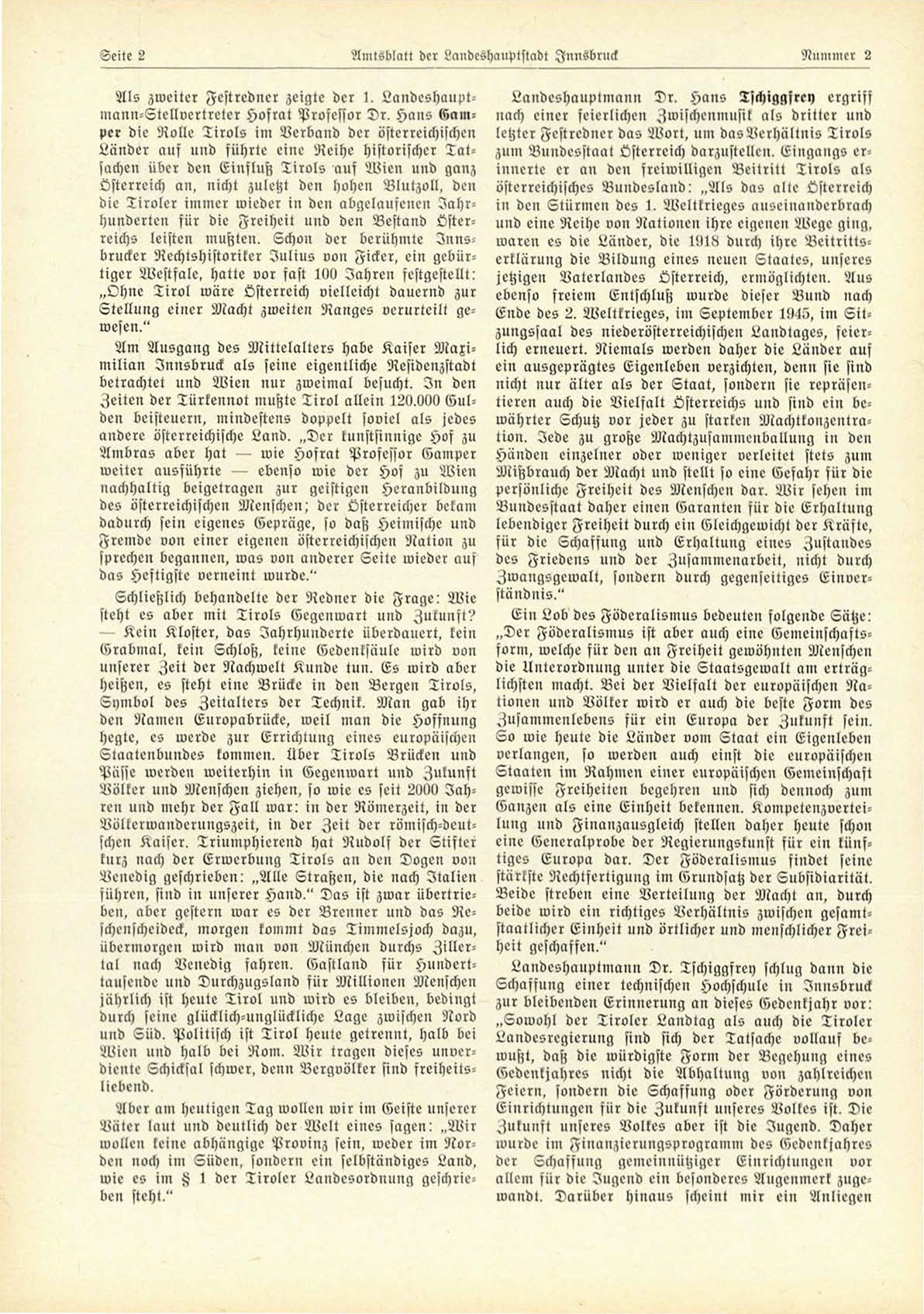 Als zweiter Festredner zeigte der 1. Landeshauptmann-Stellvertreter Hofrat Professor Dr. Hans Gamper die Nolle Tirols im Verband der österreichischen