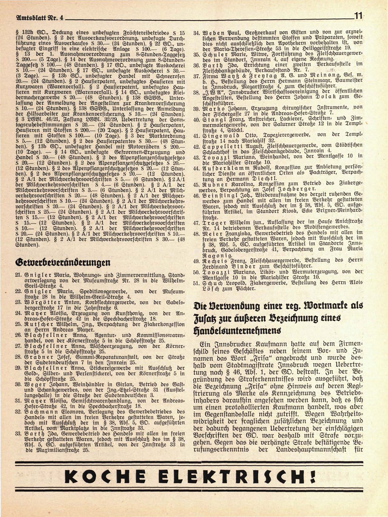 Ein Innsbrucker Kaufmann hatte auf dem Firmenschild seines Geschäftes neben feinem Vor- und Zunamen das Wort „Frisa" angebracht und wurde deshalb vom Stadtmagistrate Innsbruck wegen Uebertretung nach § 46, Abs. 1, der GO. bestraft. I n der Begründung des Straferkenntnisses wird ausgeführt, daß