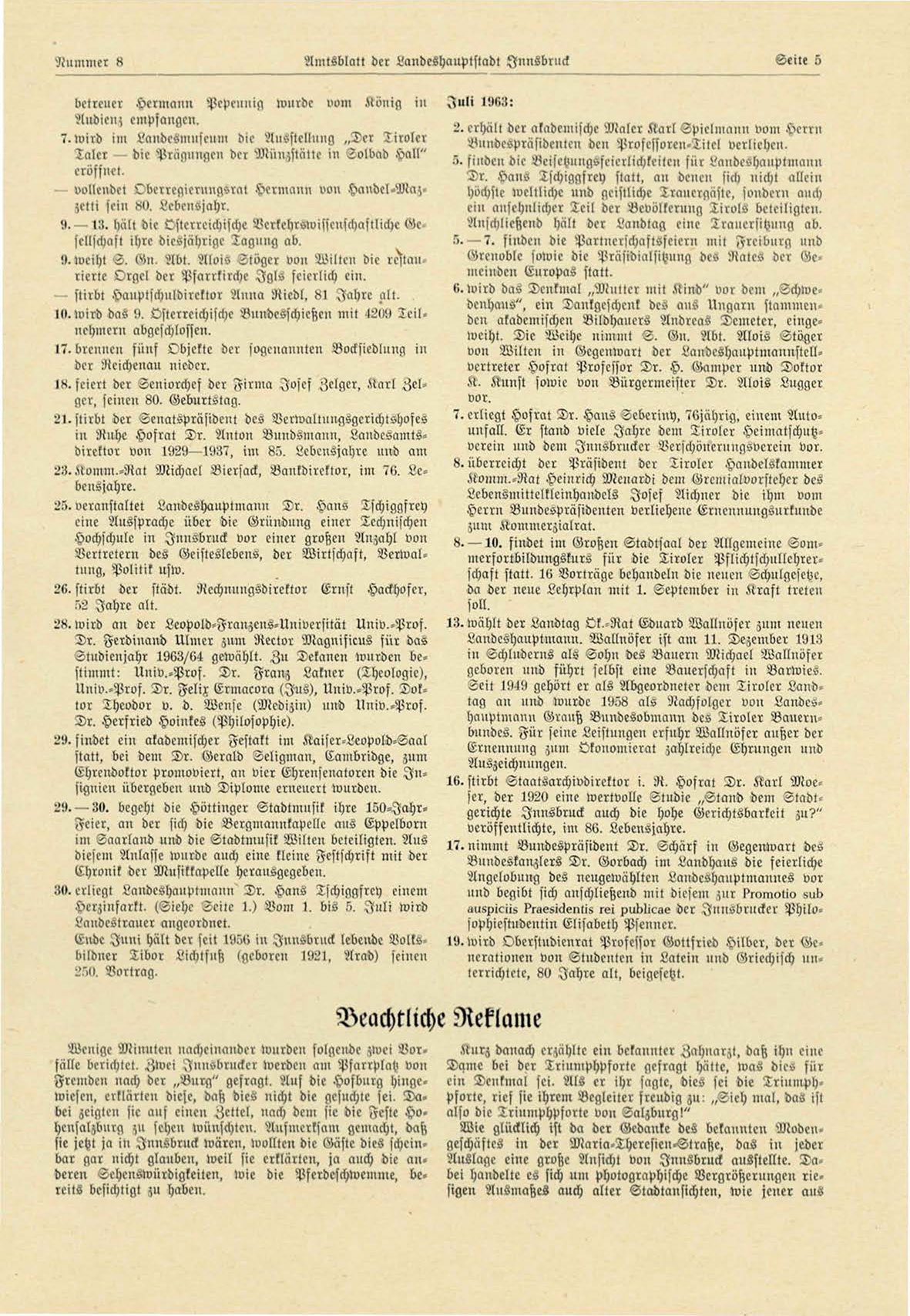 16. stirbt Staatsarchivdirektor i. R. Hofrat Dr. Karl Moeser, der 1920 eine wertvolle Studie „Stand dem Stadtgerichte Innsbruck auch die hohe Gerichtsbarkeit zu?"