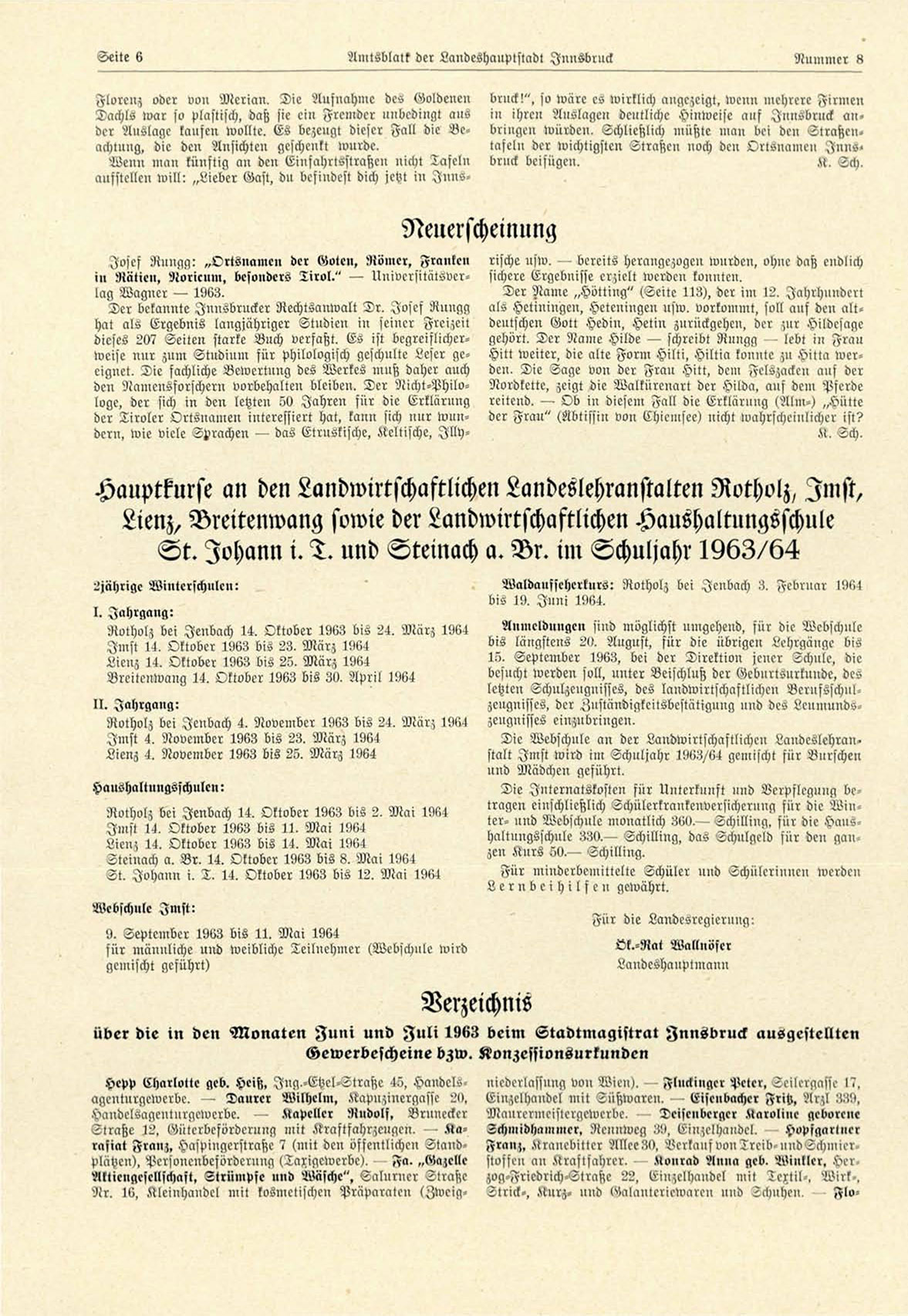 über die in den Monaten J u n i und F u l l 1963 beim Stadtmagistrat Innsbruck ausgestellten