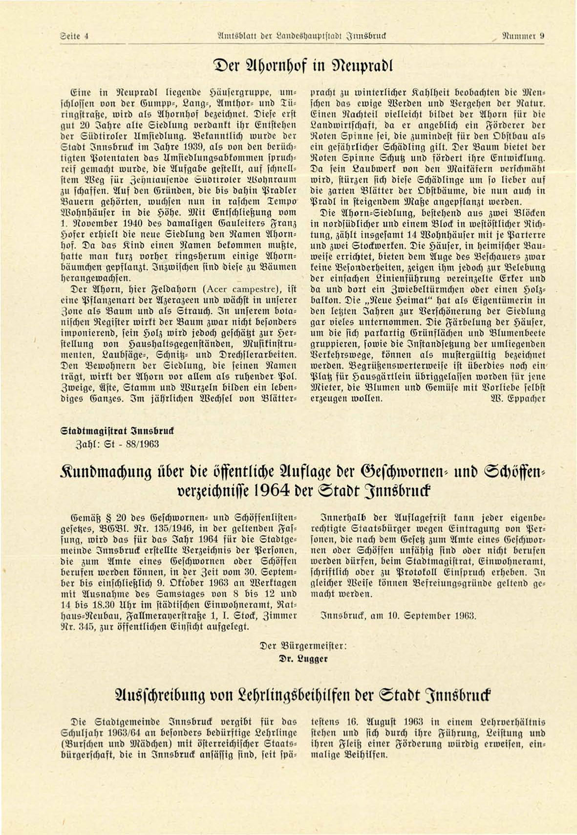Gemäß tz 20 des Geschwornen- uud Schöffenlistengesetzes, V G V l . Nr. 135/1946, in der geltenden Fassung, wird das für das Jahr 1964 für die Stadtgemeinde Innsbruck erstellte Verzeichnis der Personen,