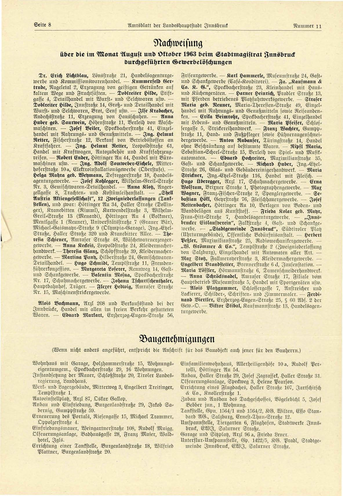 Michael-Gaismayr-Straße 9 (Olympia-Garage), Ing.-EtzelStraßc, Hallcr Straße 320 und Krancbitter Allee. — Theresia Schicncr, Amrascr Straße 48, Wäschcwarcncrzeugcrgewerbe. - Anna Keckeis, Lcopoldstraßc 24, Kleidermacherhandwerk.—Theresia Glanz, Schöpfstraßc 39, Kleidermachcrgewerbe. — Martina Pany, Hilberstraße 24, GcmischtwarenDctailhandel. - Hugo Schmidt, Teuiplstraße 11, Frcmdcnfnhrerkonzession. — Margaret« Loserer, Ncnnwcg 14, Gastund Schankgewcrbe. — Valentin Mosna, Speckbacherstraße