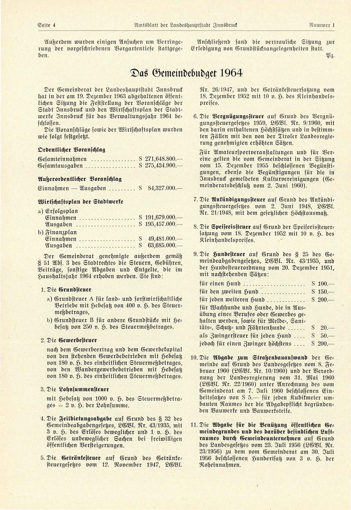 Stadt Innsbruck und den Wirtschaftsplan der Stadtwerte Innsbruck für das Verwaltungsjahr 1964 beschlossen.