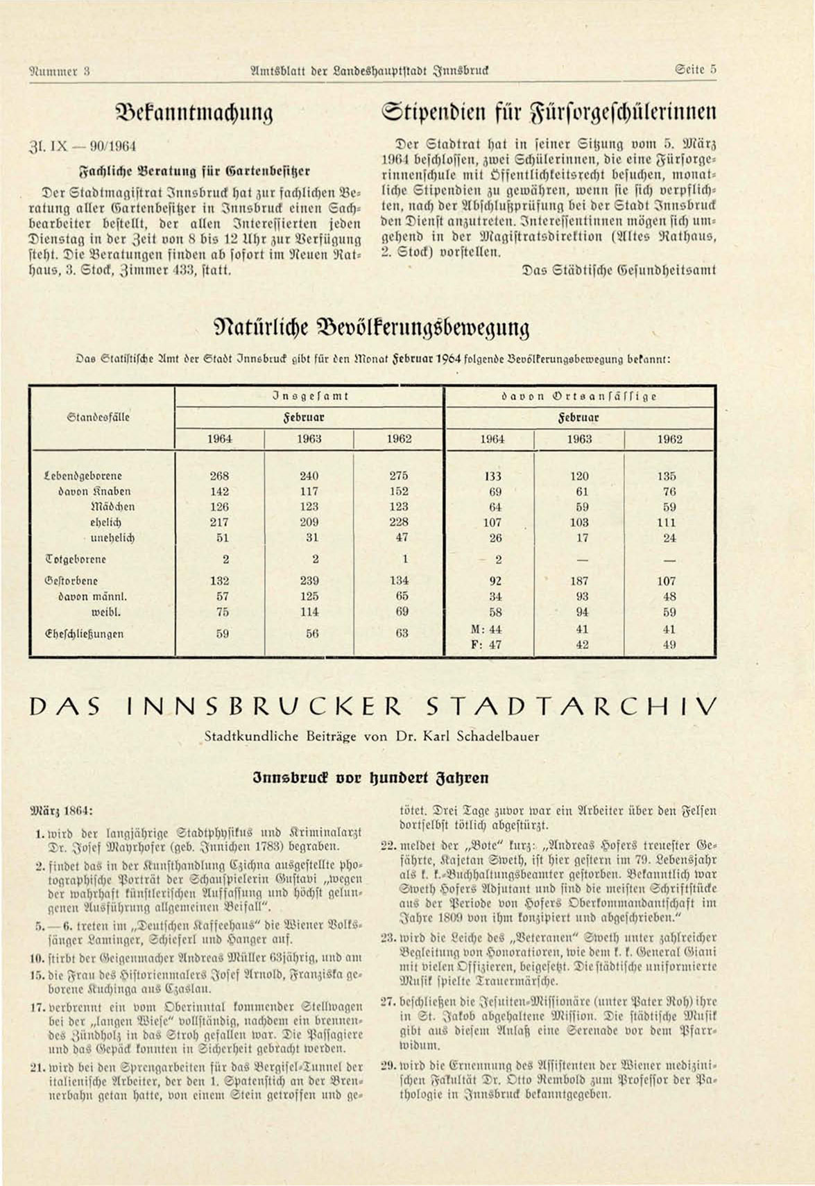 Aint l^er Sta^t ^nnsbiuck s,il"t für ccn N^ncit Februar 1Y64 folgende üeoölkcrungol"rwr^uns,