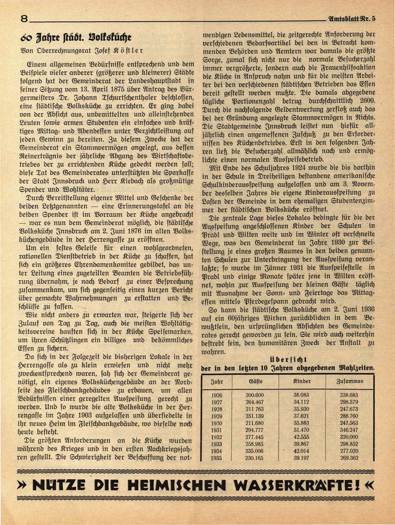 Die Stadtgemeinde Innsbruck leistet nun hiefür alljährlich einen angemessenen Zuschuß zu den Erfordernissen des Küchenbetriebes. Erst in den folgenden Jahren ließ die Besucherzahl allmählich nach und ermöglichte einen normalen Ausspeisebetrieb.