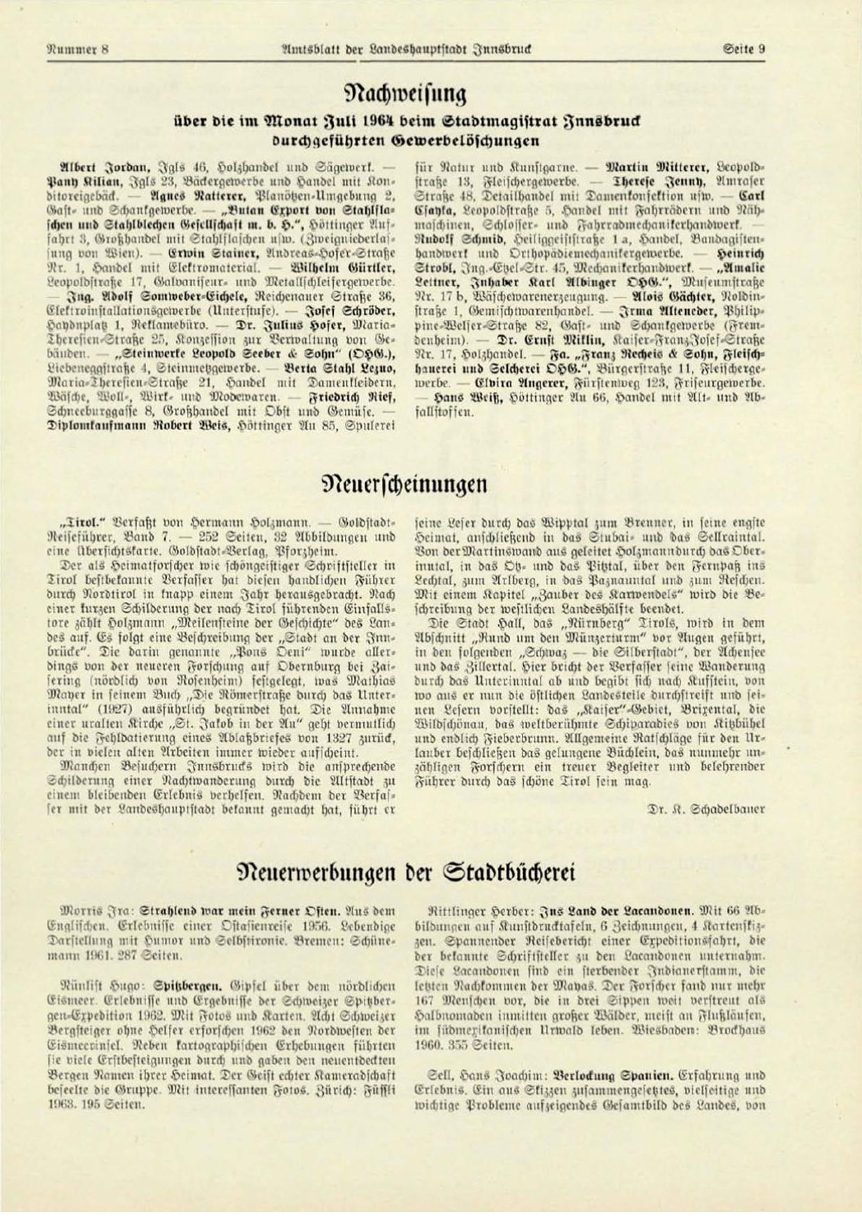 über die im Monat Juli 1964 beim Stadtmagistrat Innsbruck durchgeführten Gewerbelöschungen