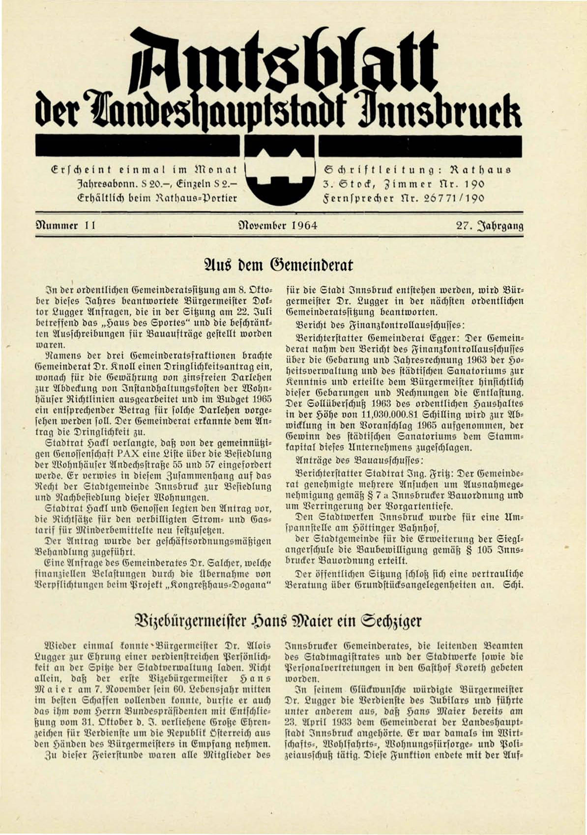 -"3. A p r i l 1933 dem Gemeinderat der Landeshauptstadt Innsbruck angehörte. Er war damals im W i r t schafts-. Wohlfahrts-, Wohnungssürsorge- und P o l i zeiausschuß tätig. Diese Funktion endete mit der Auf-