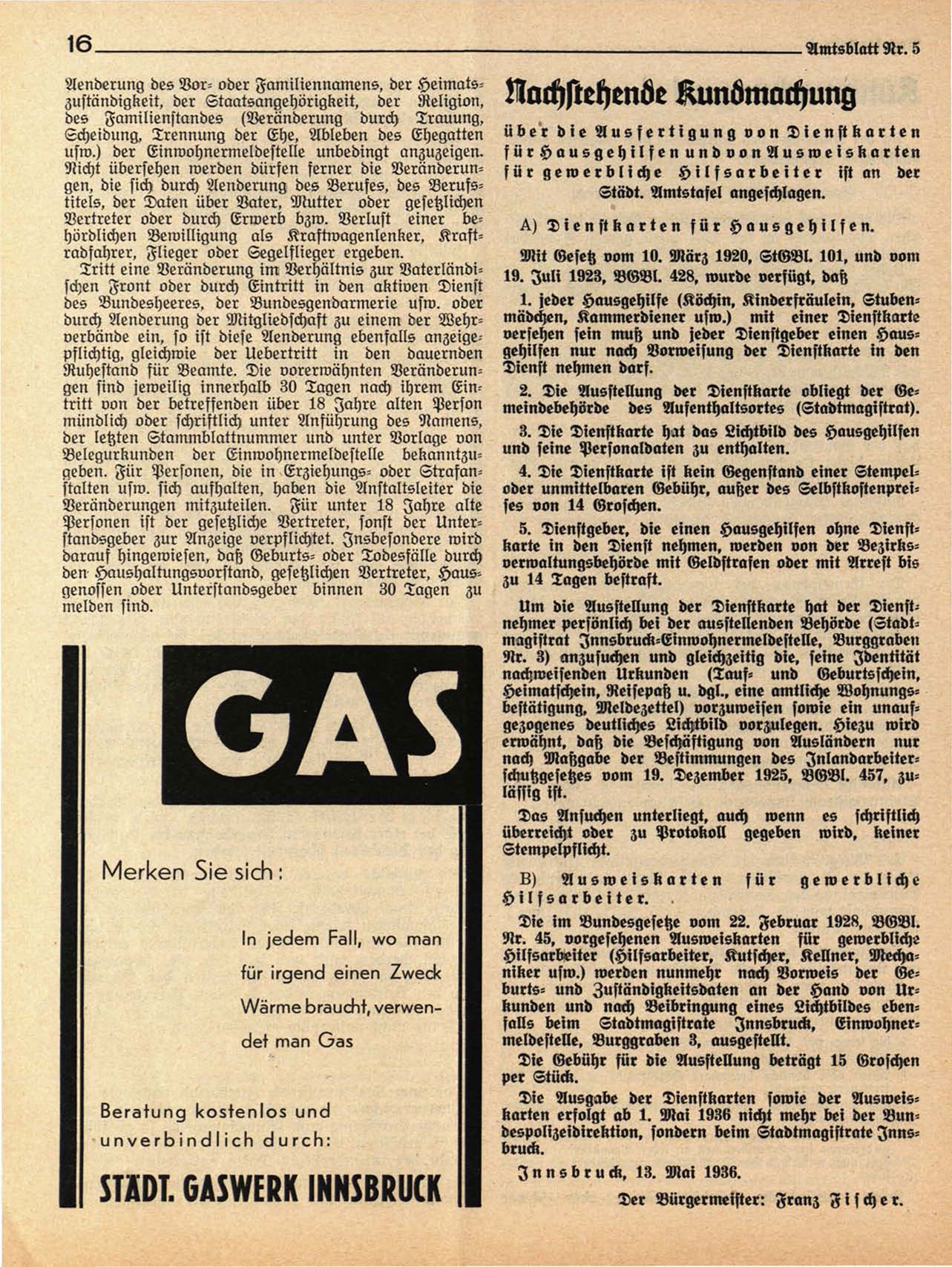Die Ausgabe der Dienstkarten sowie der Ausweiskarten erfolgt ab 1. Mai 1938 nicht mehr bei der Bundespolizeidirektion, sondern beim Stadtmagistrate Innsbruck.