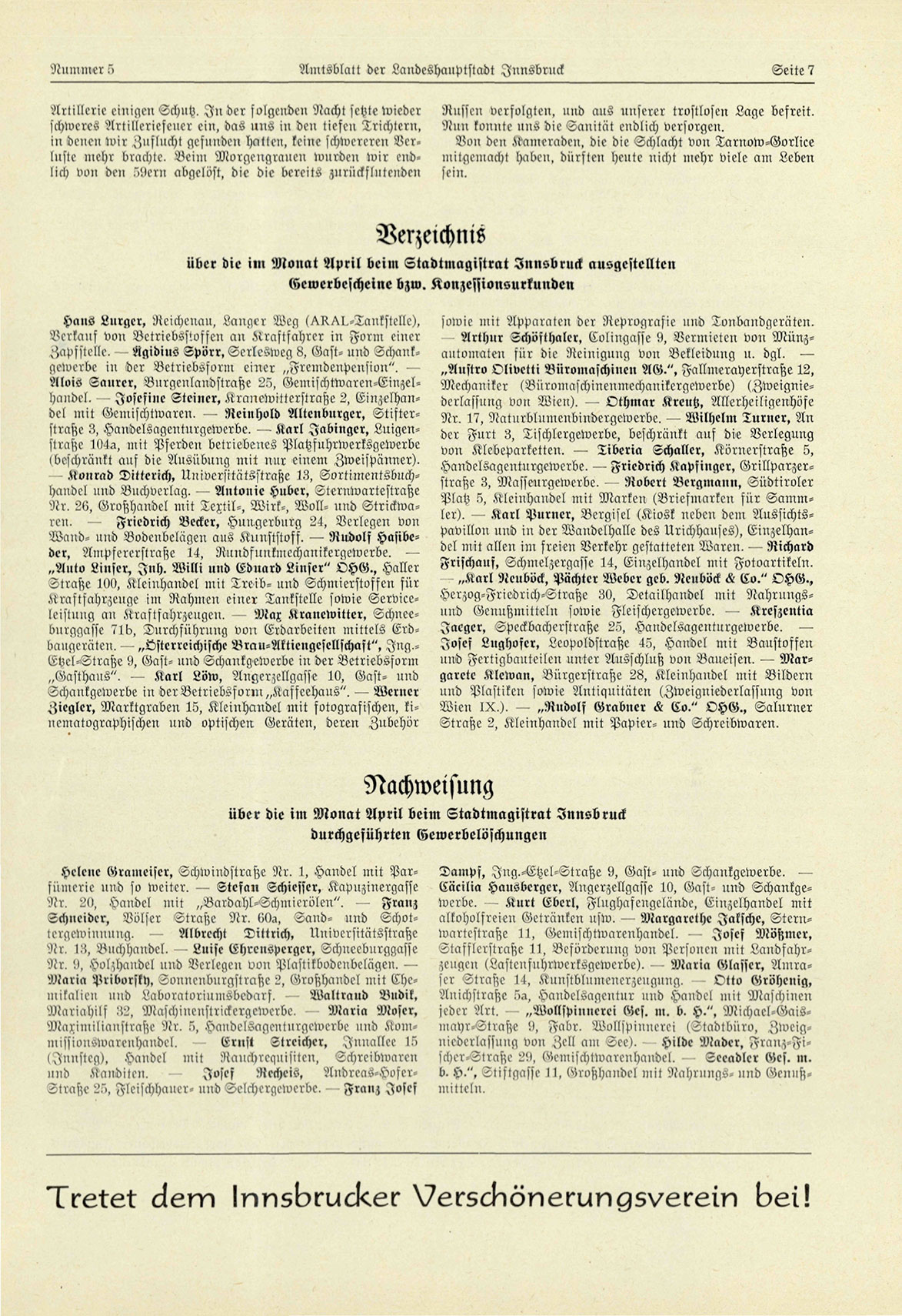 Platz 5, Kleinhandel mit Marken (Briefmarken für Sammler). — Karl Purner. Bergisel (Kiosk neben dem Anssichtspavillon und in der Wandelhalle des Urichhauses), Einzelhandel mit allen im freien Verkehr gestatteten Waren. — Richard