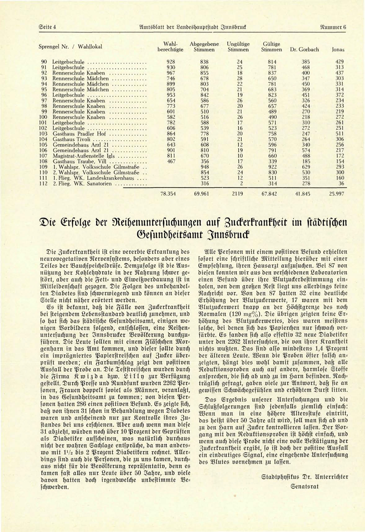 so hat sich das städtische Gesundheitsamt, einigen wenigen Vorbildern folgend, entschlossen, eine Reihenuntersuchung der Innsbrucker Bevölkerung durchzuführen. Die Leute sollten mit einem Fläschchen Morgenharn in das Amt kommen, und dieser sollte durch