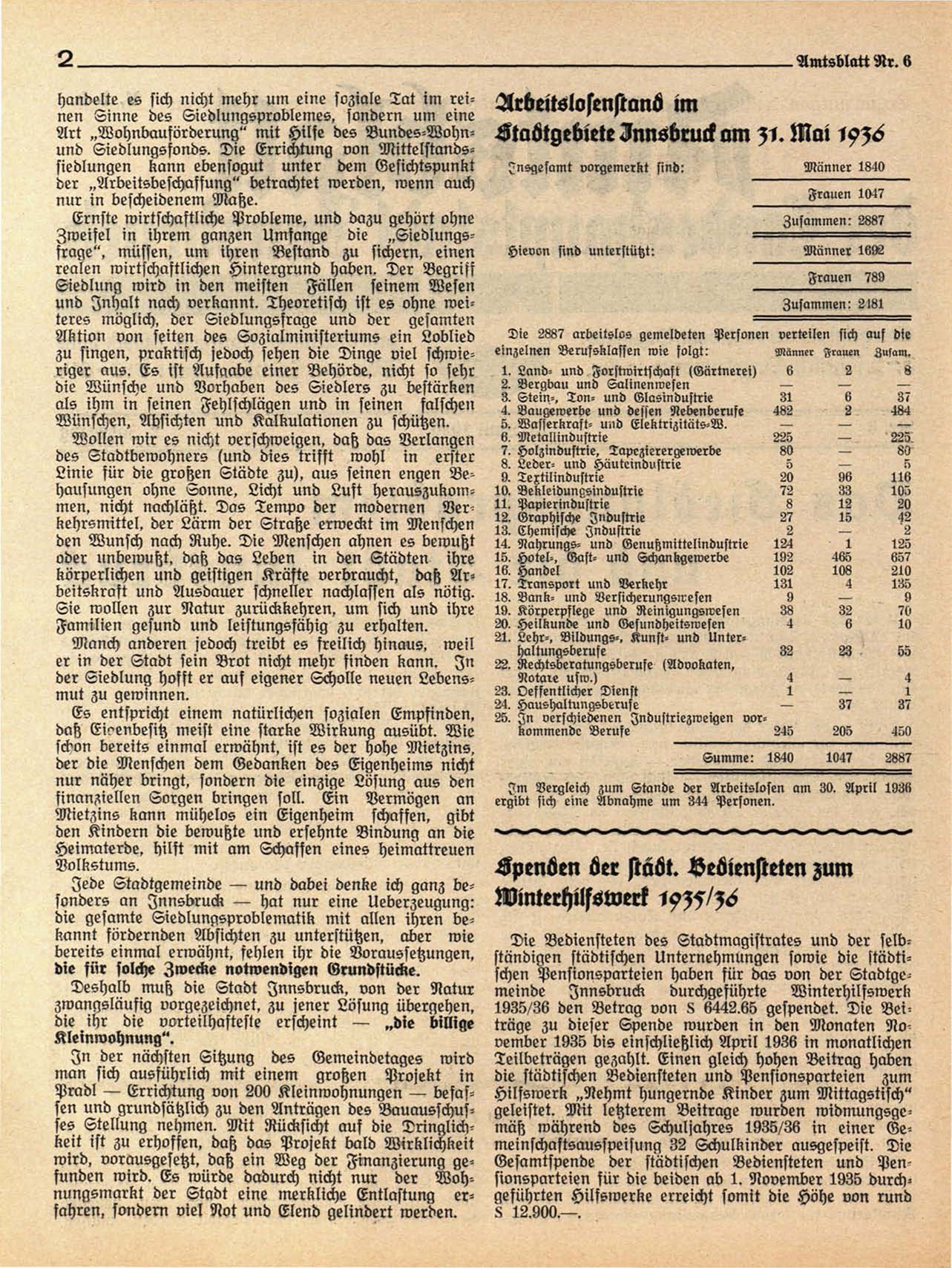 Gesamtspende der städtischen Bediensteten und Pensionsparteien für die beiden ab 1. November 1935 durchgeführten Hilfswerke erreicht somit die Höhe von rund
