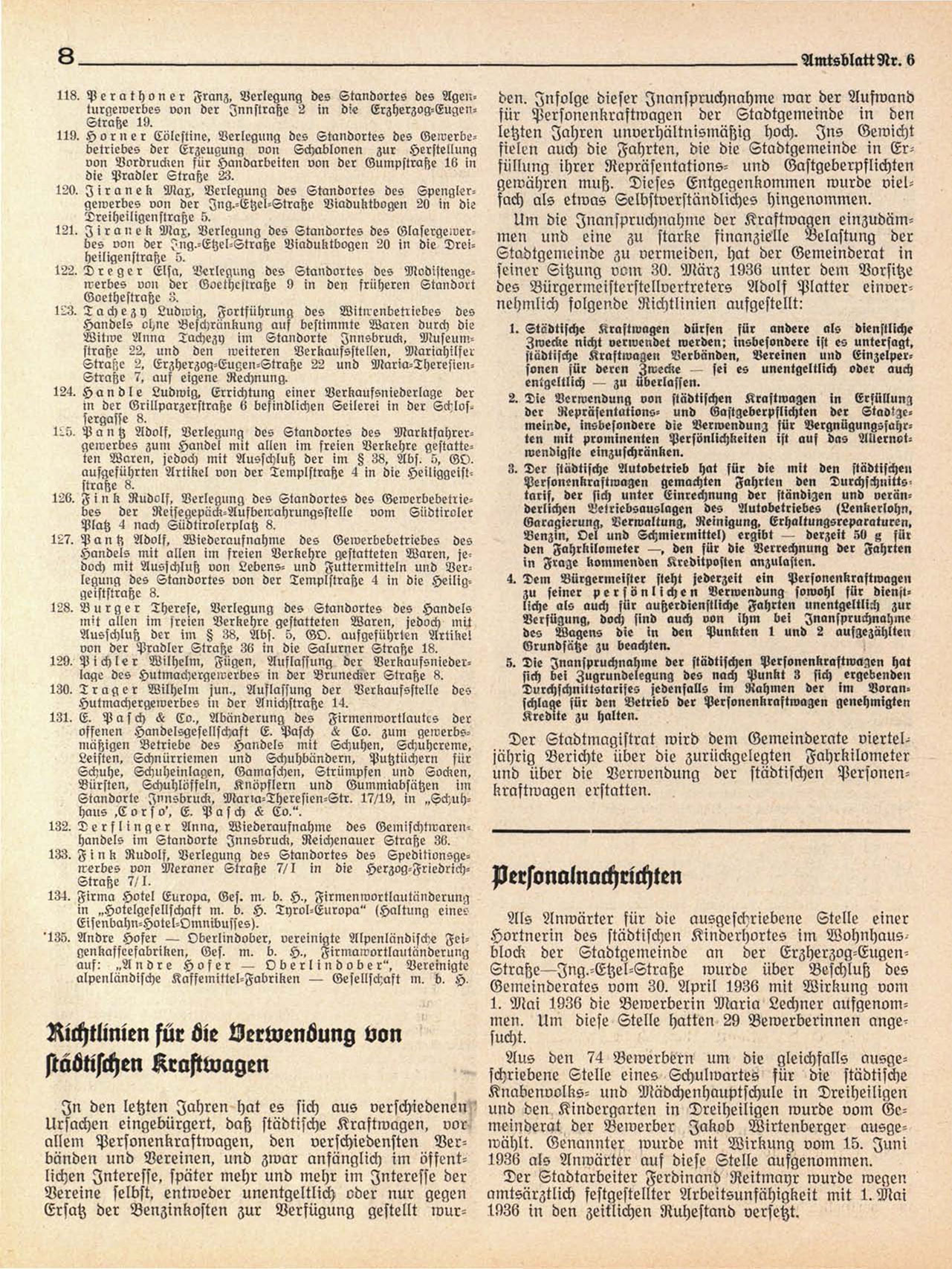 118. P e r a t h o n e r Franz, Verlegung des Standortes des Agenturnewerbes von der Innstraße 2 in die Erzherzog-EugenStraße 19.