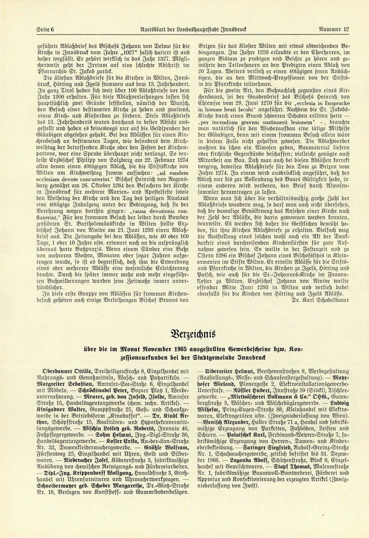 über die im M o n a t November 1965 ausgestellten Gewerbescheine bzw. Konzessionsurkunden bei der Stadtgemeinde Innsbruck