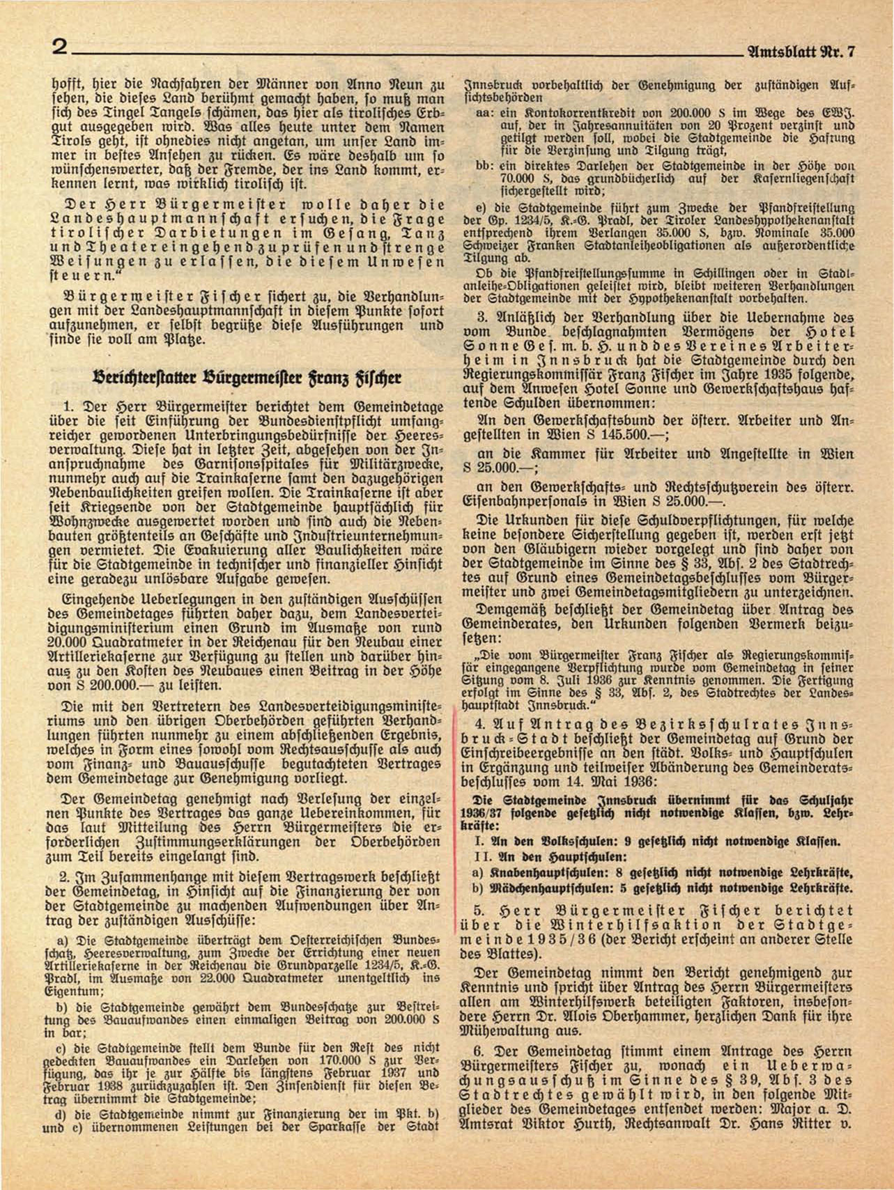Februar 1938 zurückzuzahlen ist. Den Zinfendienst für diesen Betrag übernimmt die Stadtgemeinde;