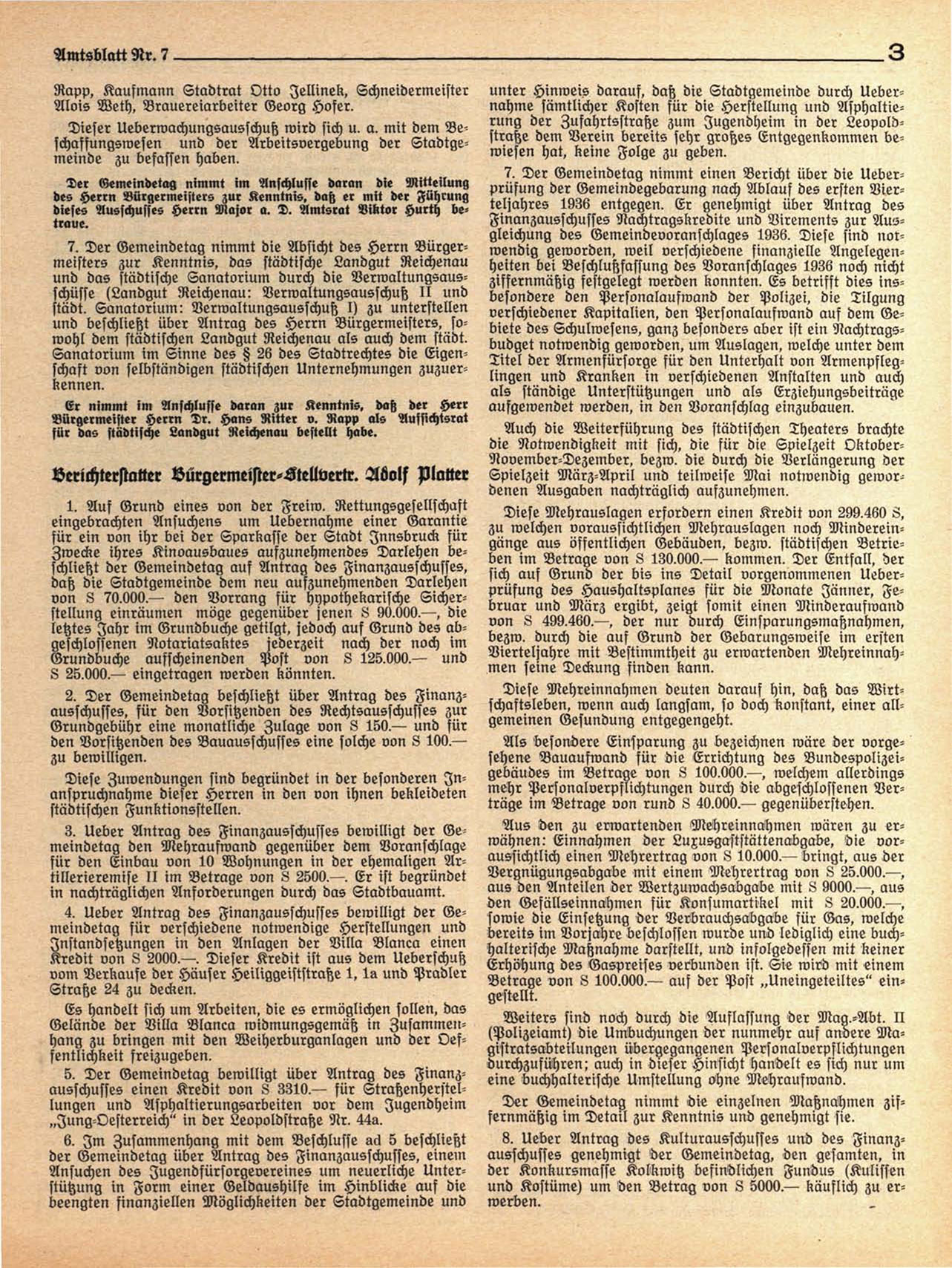 7. Der Gemeindetag nimmt einen Bericht über die Ueberprüfung der Gemeindegebarung nach Ablauf des ersten Vierteljahres 1936 entgegen. Er genehmigt über Antrag des