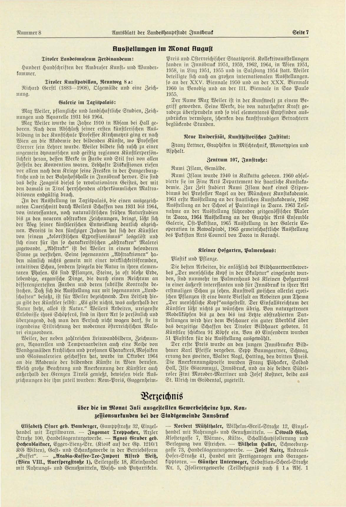 I u der Ausstellung im Taxispalais, die einen ausgezeichneten Querschnitt durch Weilers Schaffen von 1931 bis 1964, Ausstellung an der School of P a i n t i n g s i n Dacca. 1963 T e i l nahme an der Ausstellung führender zeitgenössischer M a l e r