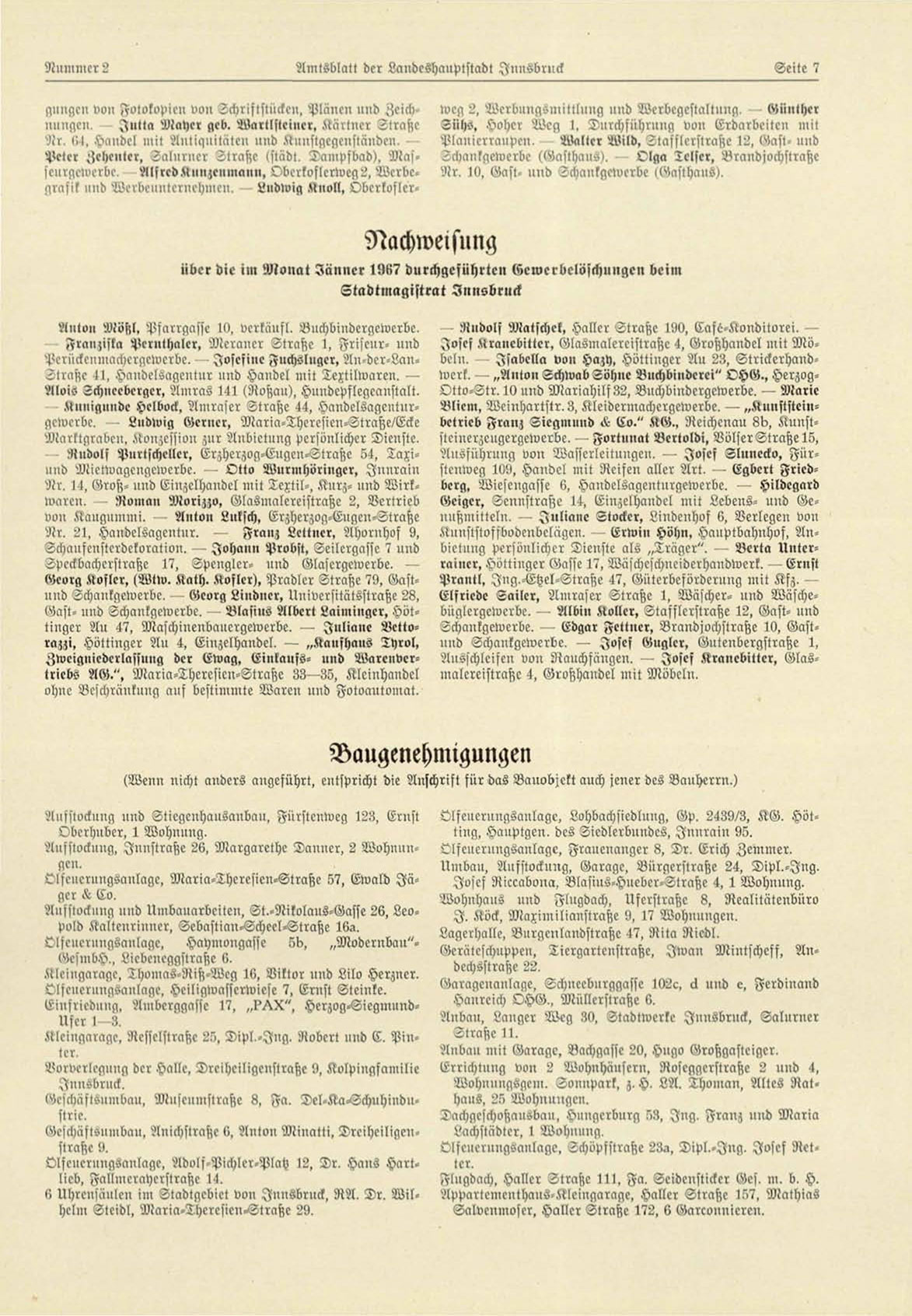 Schankgewerbe. — Edgar Fettner, Brandjochstrahe 10, Gastuud Schaukgewerbe. — Josef Gugler, Giltenbergstraße 1,