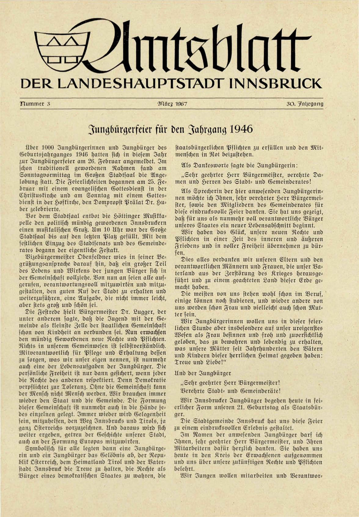 W i r Innsbrucker Iungbürger begehen heule in feierlicher Forni unsereii ^."1, Gelnirlstag als Staatsbürger.