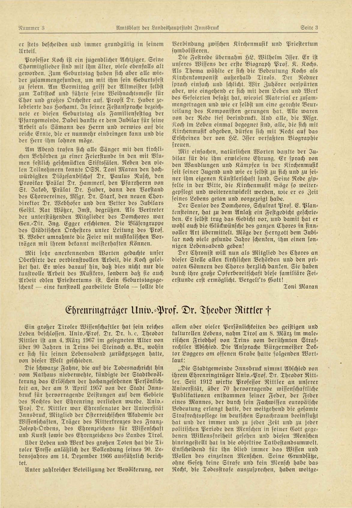 vom Rathaus niederwehte, kündigte der Stadtbevölkerung das Erlöschen der hochangesehenen Persönlichkeit an. der am !», A p r i l 1l>57 von der Stadt I n n s bruck für hervorragende Leistungen auf dem Gebiete