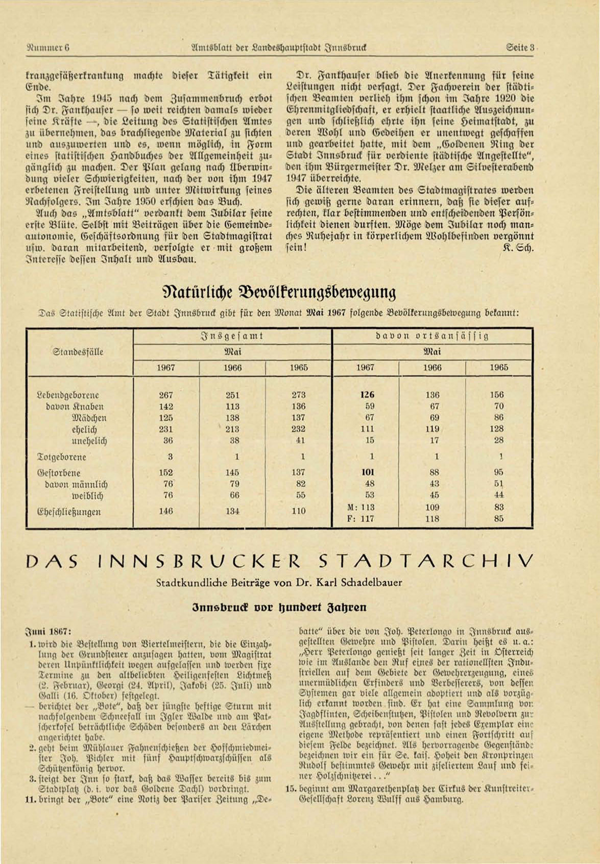 Statistische Amt der Stadt Innsbruck gibt für den Monat M a i 1967 folgende Bevölkerungsbewegung bekannt: