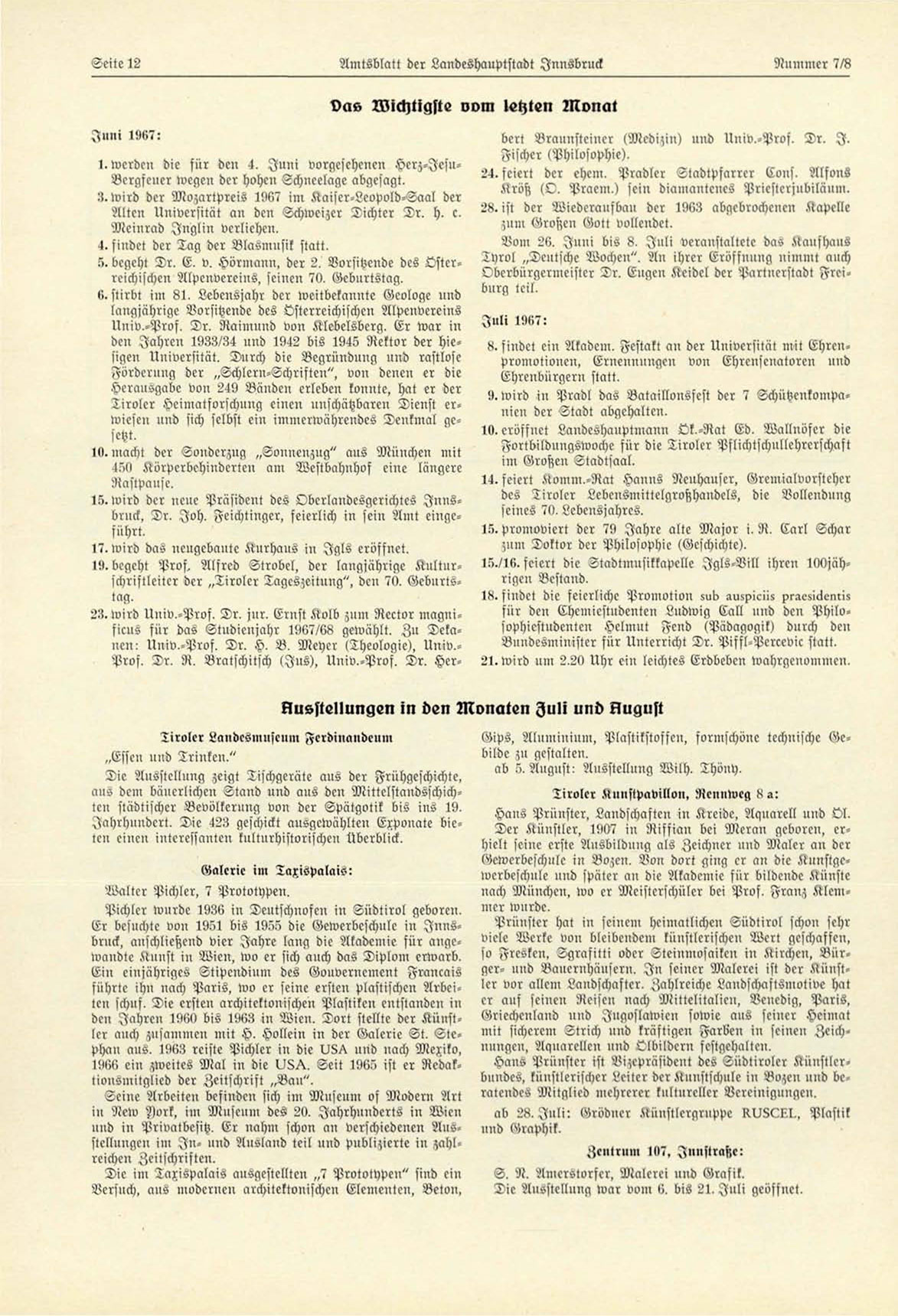 23 wird Univ.-Prof. Dr. jnr. Ernst Kolb zum Rector magnificus für das Studienjahr 1967/68 gewählt. Zu Dekanen: Univ.-Prof. Dr. H. B. Meyer"(Theologie). Univ.Prof. Dr. R. Bratschitsch (Ins), Univ.-Prof. Dr. Her-