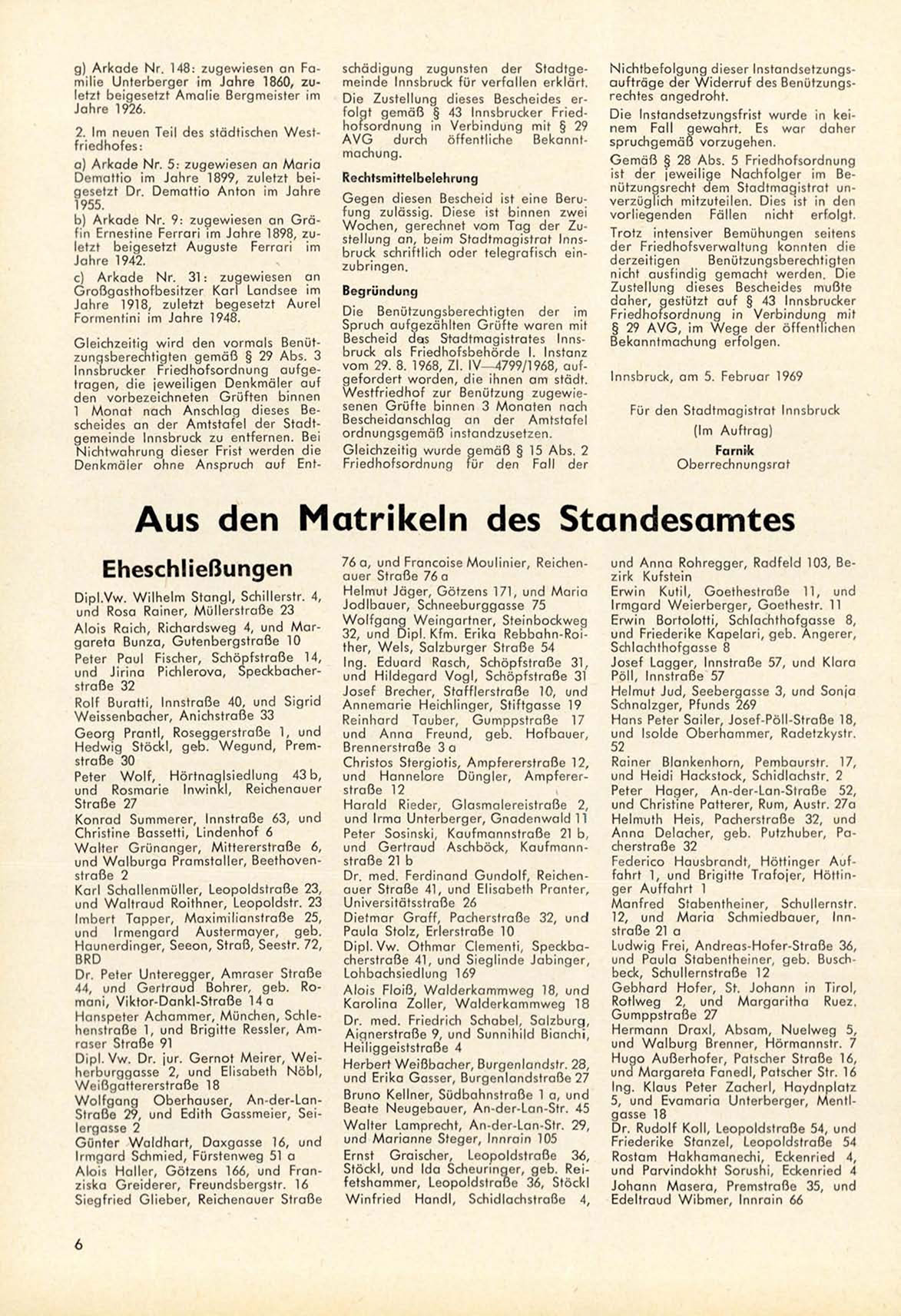 B e s c h e i d das S t a d t m a g i s t r a t e s Innsbruck als F r i e d h o f s b e h ö r d e I. Instanz