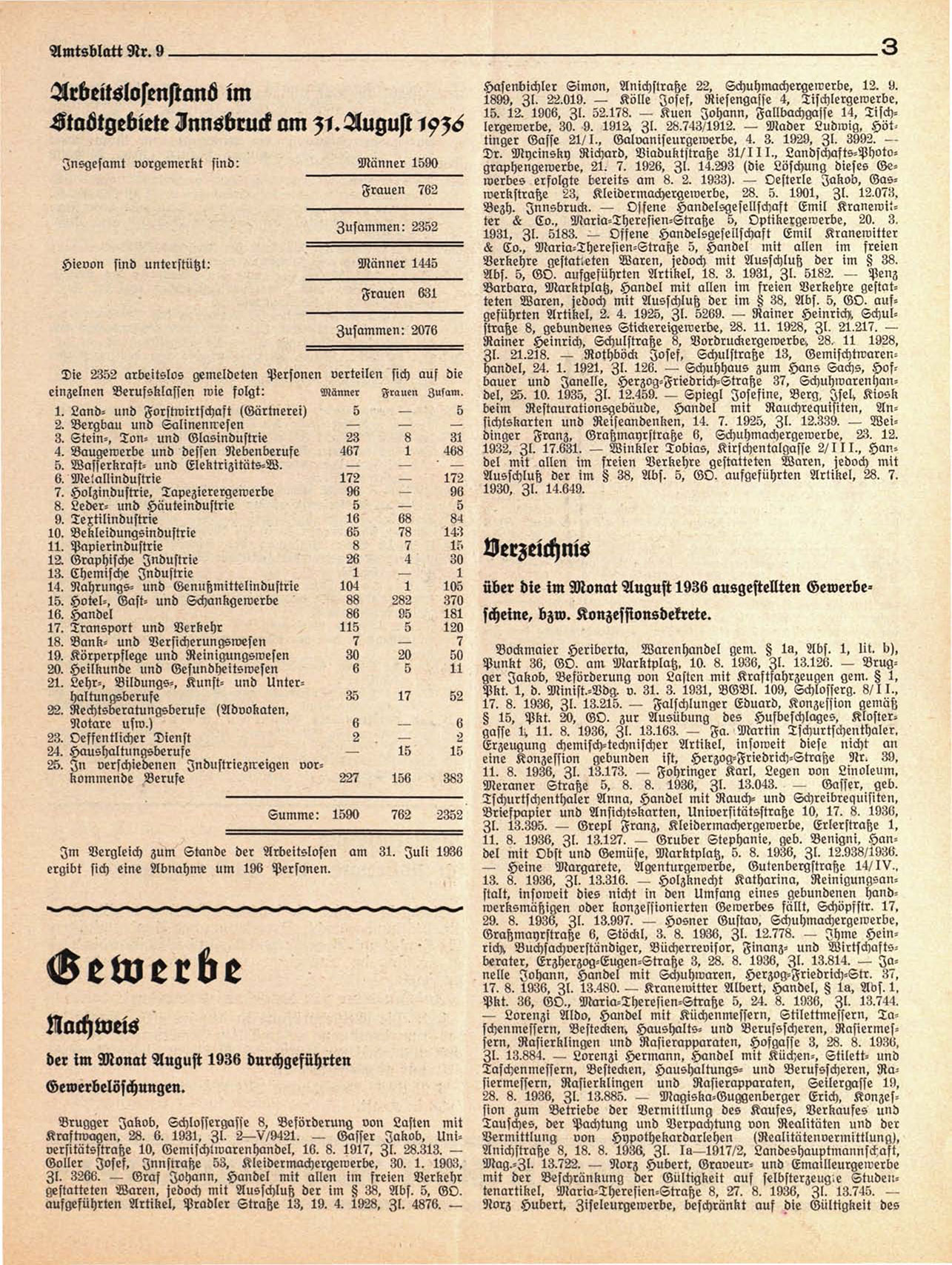 Graßmayrstraße 6. Stockt, 3. 8. 1936, ZI. 12.778. — Ihme Heinrich, Buchsachverständiger, Bücherrevisor, Finanz- und Wirtschaftsberater, Erzherzog-Eugen-Straße 3, 28. 8. 1936. Zl. 13.814. — Janelle Johann, Handel mit Schuhwaren, Herzog-Friedrich-Str. 37,