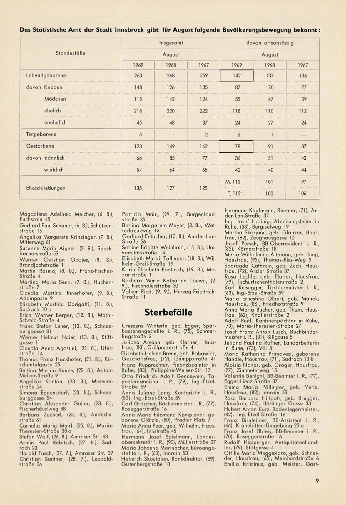 der Stadt Innsbruck gibt für August folgende B e v ö l k e r u n g s b e w e g u n g