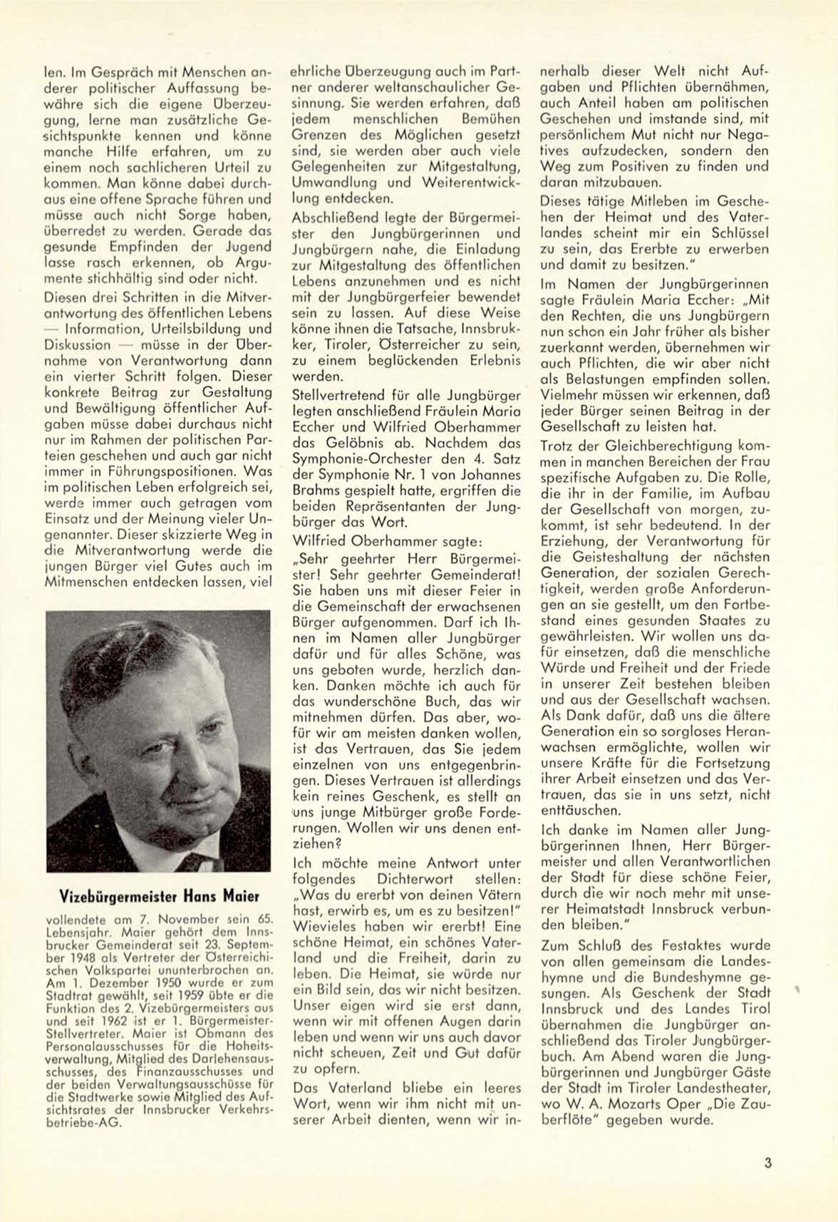 L e b e n s j a h r . M a i e r g e h ö r t d e m Innsb r u c k e r G o m e i n d e r a t seit 23. S e p t e m ber 1948 als V e r t r e t e r d e r ö s t e r r e i c h i schen V o l k s p a r t e i u n u n t e r b r o c h e n a n .